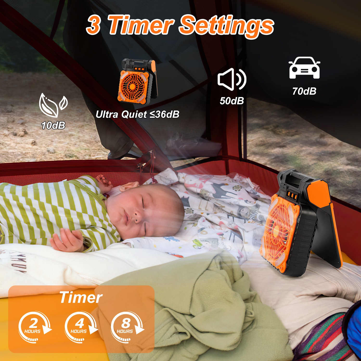 *4 Wind Speeds & 3 Timer Settings*:Built in a powerful brushless motor,this camping fan with light offers 4 speeds with up to 14.76 ft./s airflow. Additionally,it provides 3 timer settings for you to set at 2H/4H/8H,customizing your own time based on different needs.