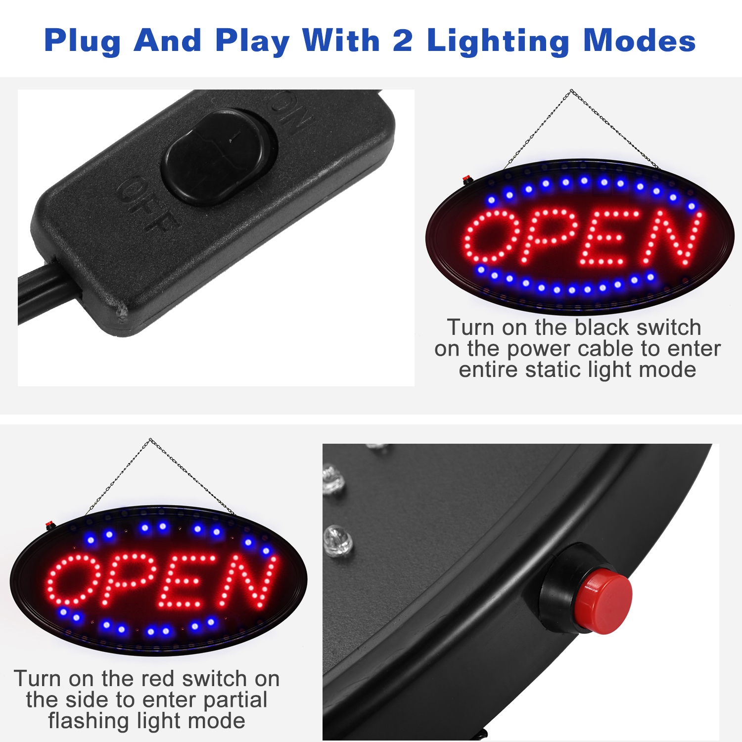 *Well-Attracting Performance*:Adopting striking red and blue LEDs and coming with two lighting modes(entire static and partial flashing),the red big LED “OPEN” letters and its surrounding blue LEDs will attract customers’ attention easily.