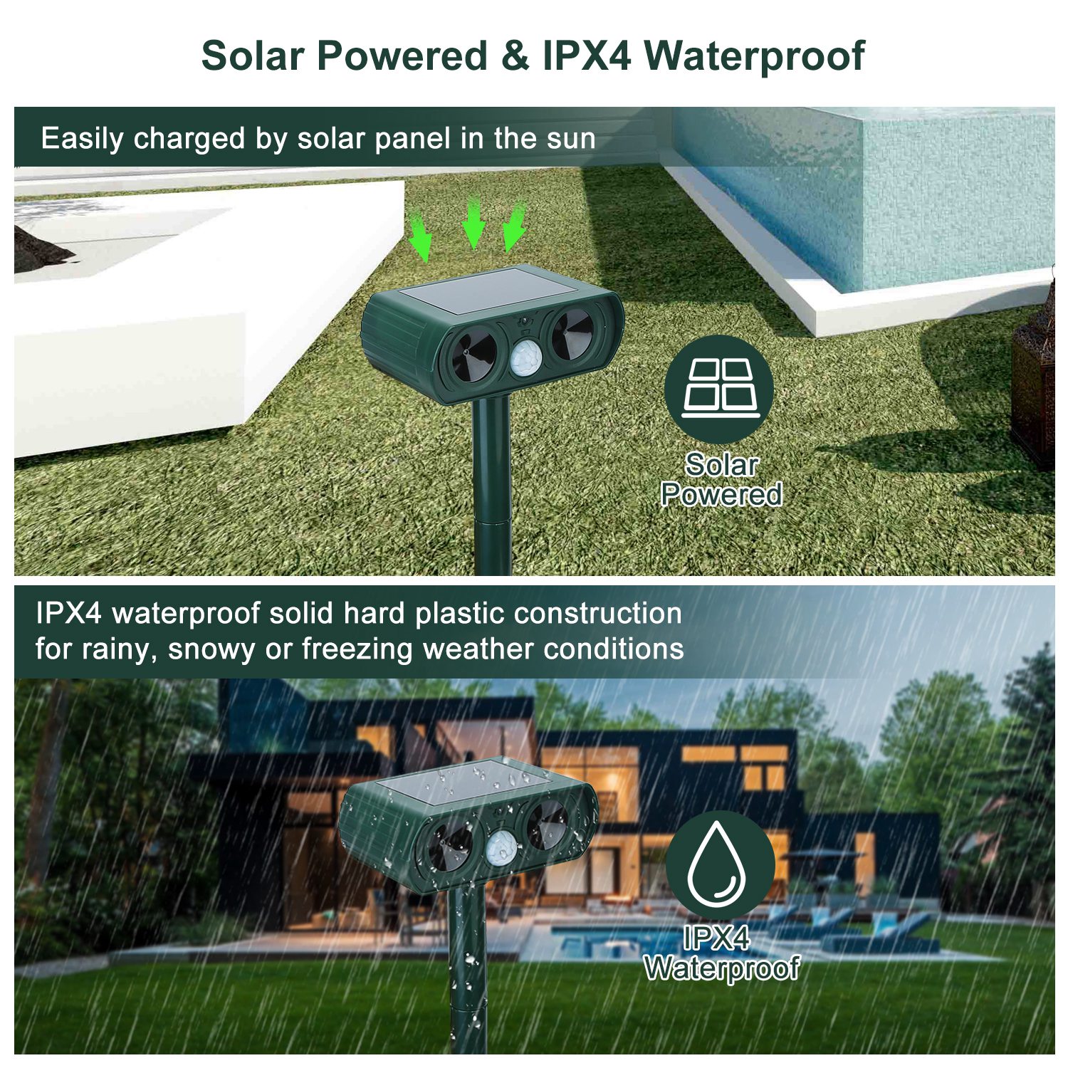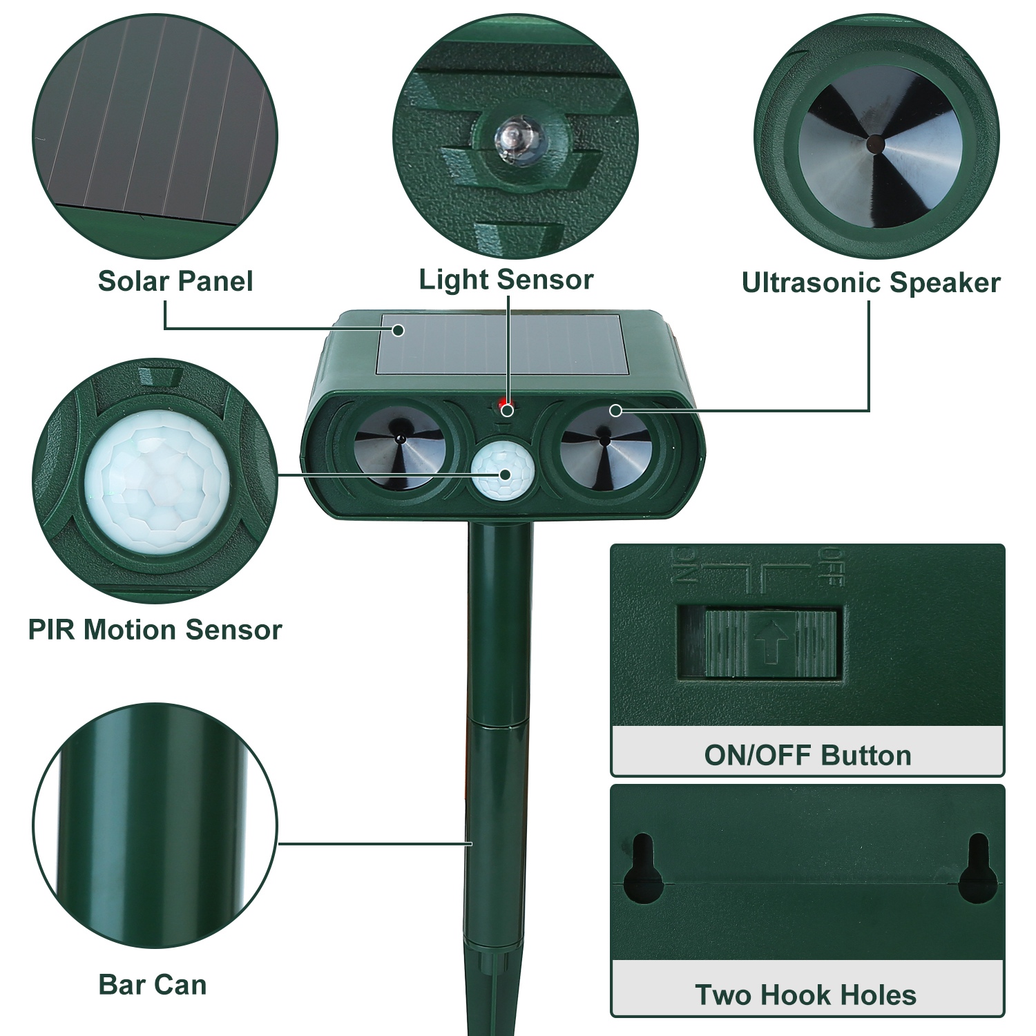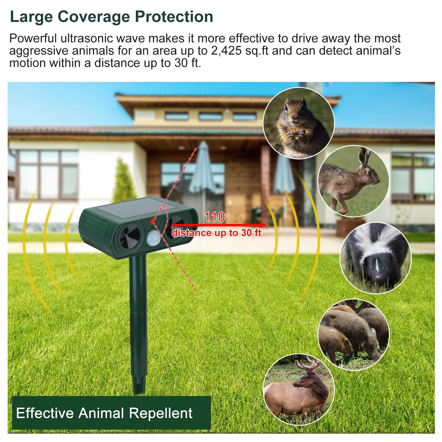 *【Upgraded Ultrasonic Animal Repeller】Adopted advanced ultrasonic and PIR motion activated technology,it can effectively repel animals and pests by emitting powerful ultrasonic wave,and the irregular and variable frequency makes it more effective to drive away the most aggressive animals which may adapt and become immune to a certain frequency band. It is effective for an area up to 2,425 sq. ft and can detect animal’s motion within a distance up to 30 ft.