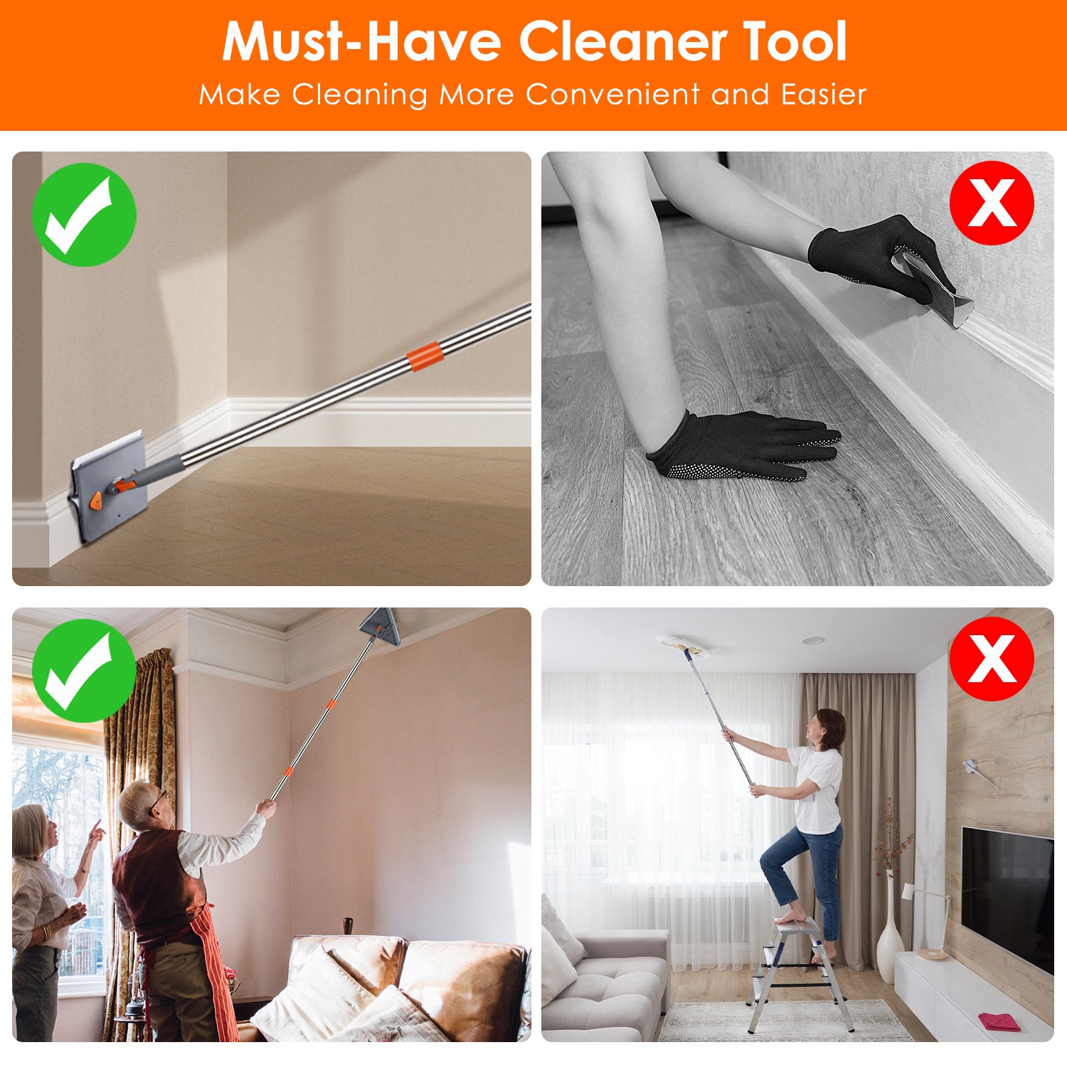 *All-Purpose Dry & Wet Mop*:Designed with 180° vertically and horizontally rotatable head,our baseboard & wall cleaning mop allows for effortlessly reach into corners and tackle hard-to-reach areas with ease,ensuring no dust or dirt goes unnoticed. Can be used for both dry and wet,indoor and outdoor conditions,this multifunctional cleaning mop is a must-have home cleaning tool for walls,ceilings,doors,windows,furniture,floors and more.