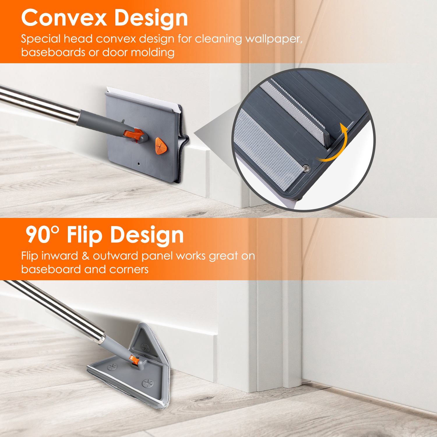 *90° Flip & Convex Design*:Updated head convex design on square mop head enhances performance on corners and edges,suitable for cleaning washable wallpaper,baseboards,woodwork,doors,wall coverings,etc.. Furthermore,90° flip inward & outward panel on triangle mop head works great on picking up the dust,pet hair and small debris on baseboard.