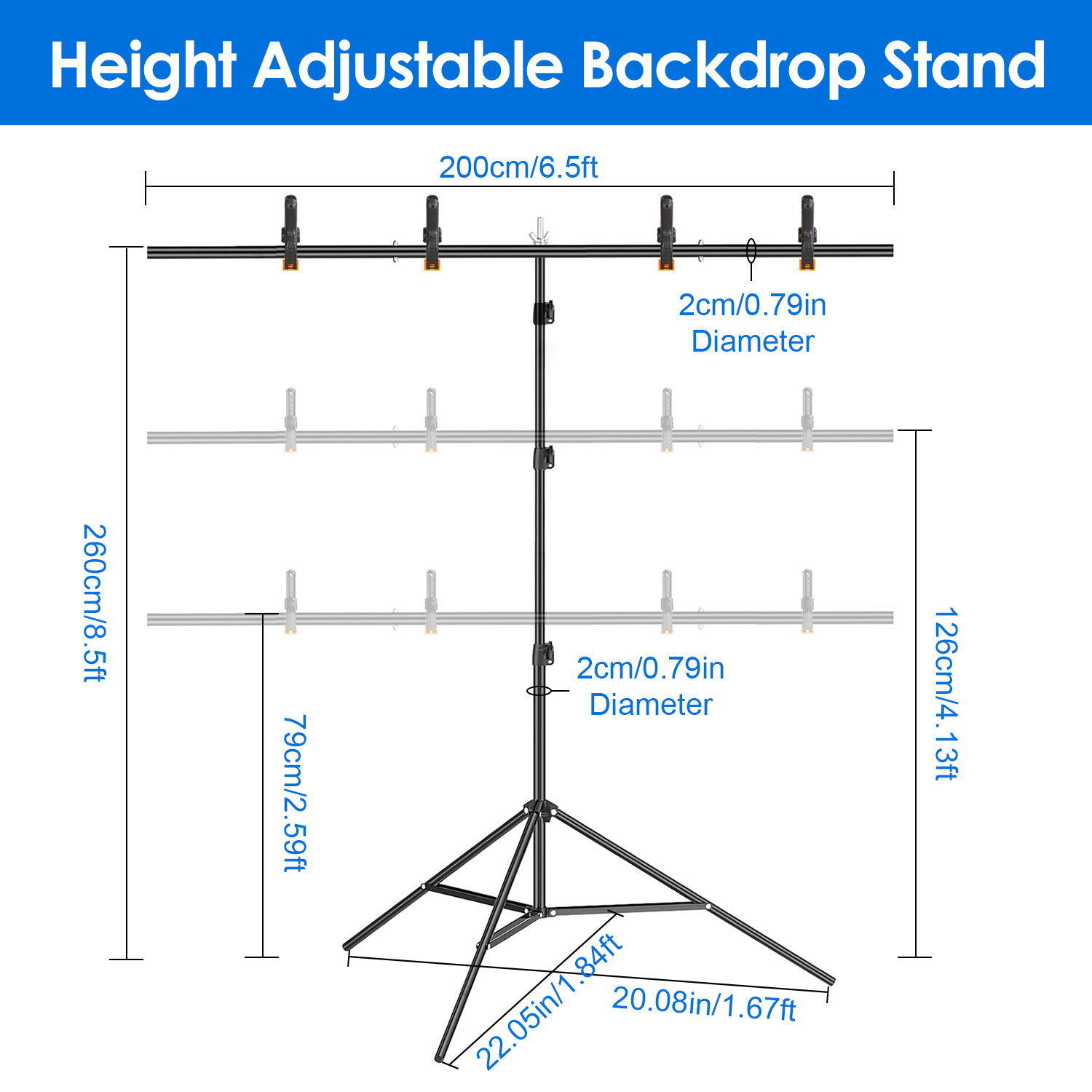 *2.59-8.5FT Adjustable Height*:The T shape backdrop stand offers a 6.5ft width and an adjustable height range from 2.59ft to 8.5ft,catering to diverse shooting needs. You can position the backdrop at the perfect level for your requirements.
