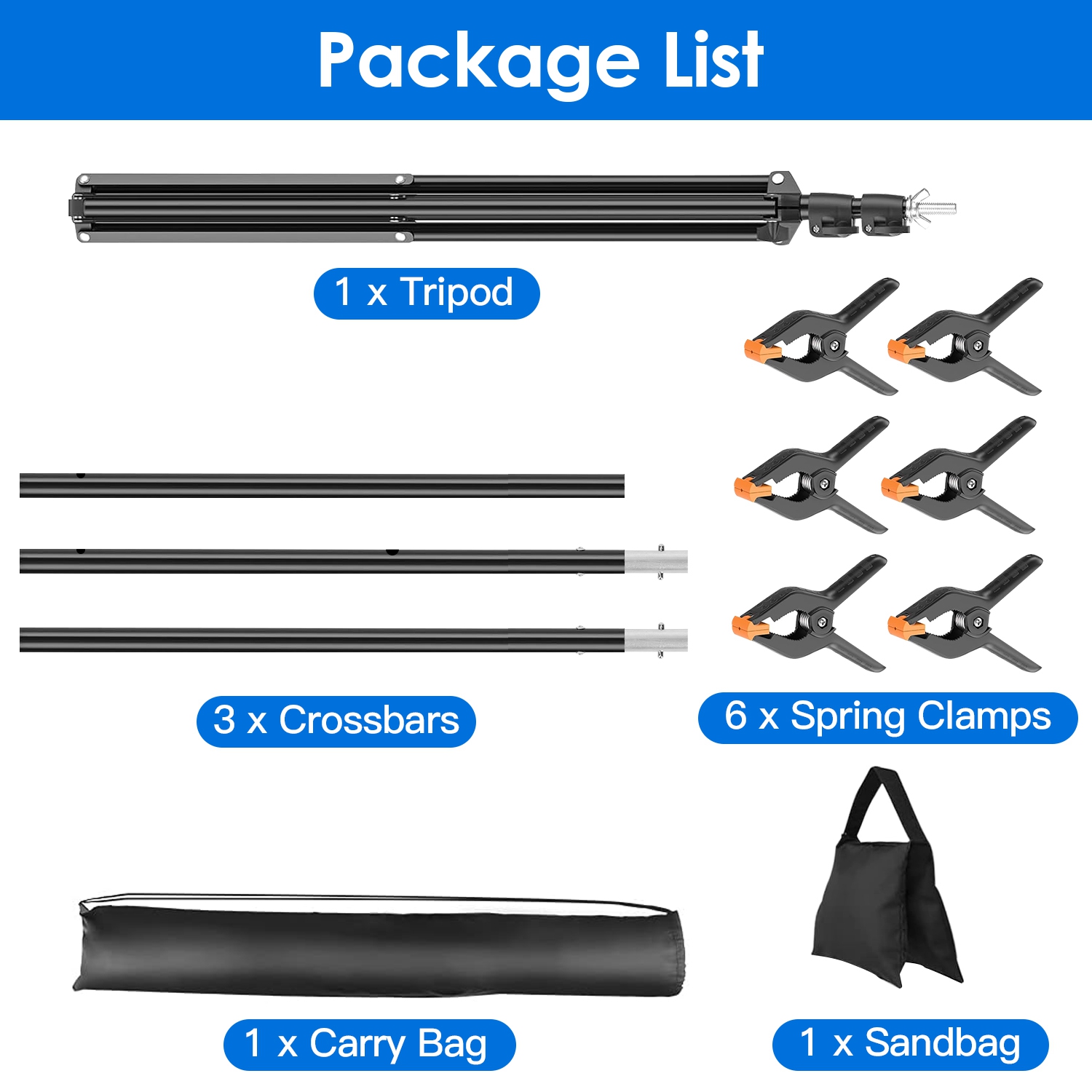 *Easy To Assemble & Disassemble*:No tools required. Just attach the crossbars with spring points and assemble them with the tripod. Coming with 1 sandbag and 1 carry bag,it doesn't take up a lot of room to store or to transport this photo backdrop stand kit.