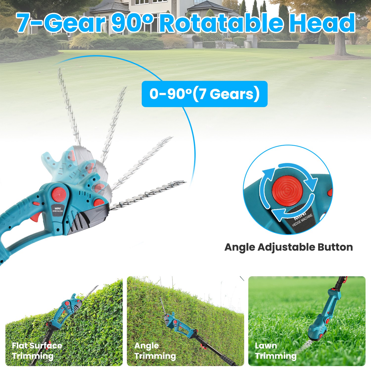*90° Adjustable Cutting Angle*:Designed with 90° adjustable working head with 7-gear adjustment,our electric hedge trimmer is capable to find the best cutting angle and access to hard-to-reach areas in various occasions. With its straightforward flexibility,you'll hold the power of gardening mastery in your hands