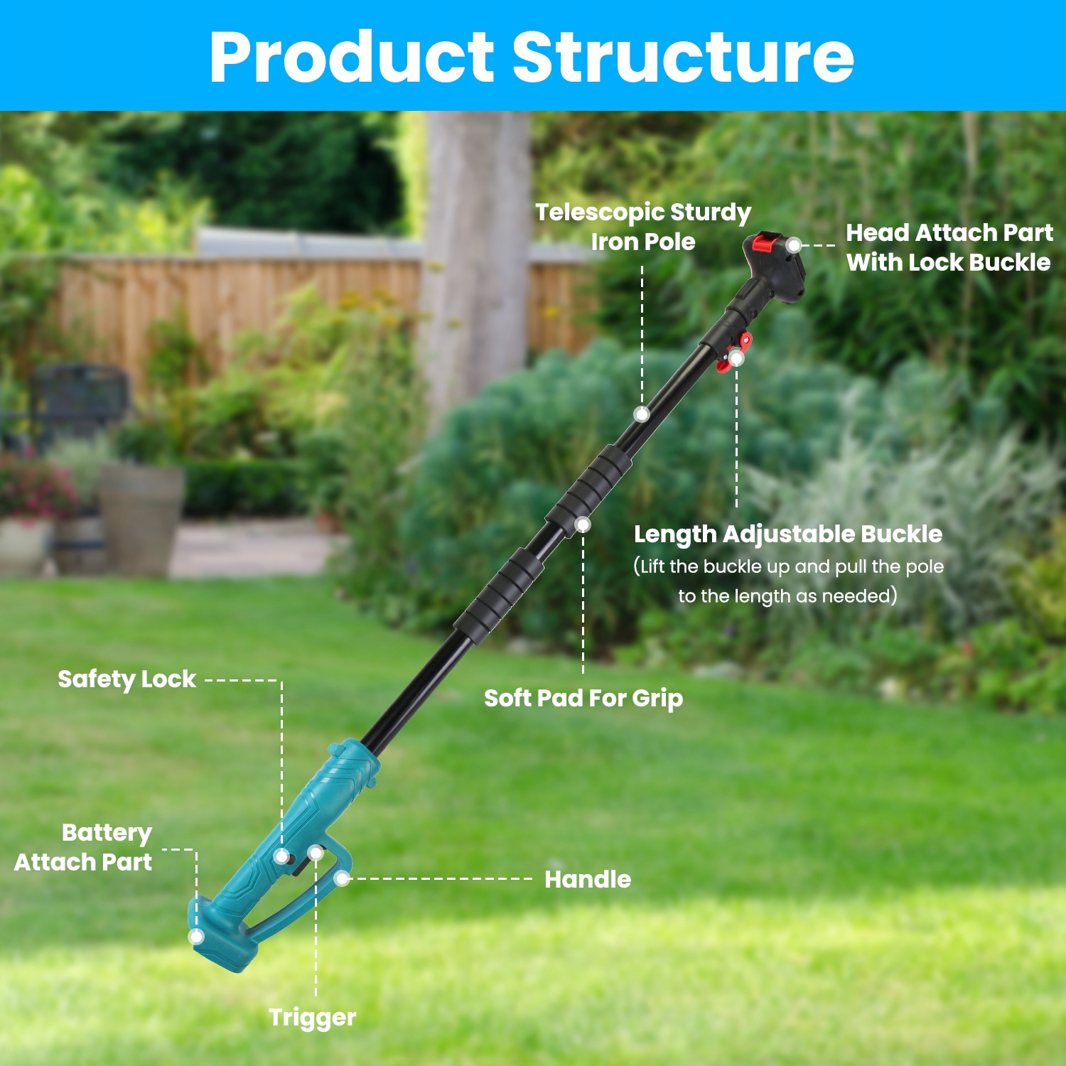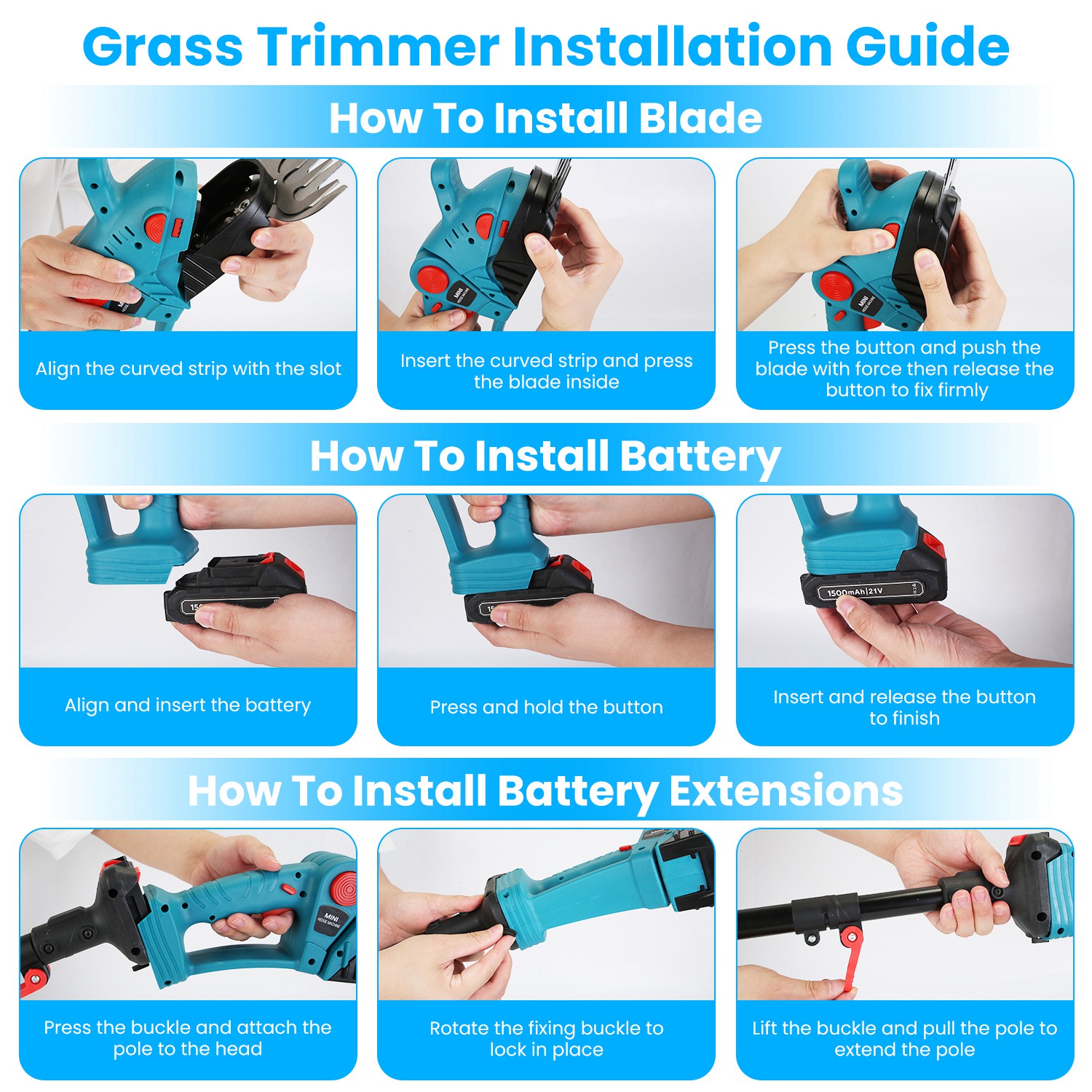 *3 In 1 Multifunctional Shear & Trimmer & High-Reach Pruner*:We provide replaceable SK5 steel hedge blade and lawn blade,sturdy and sharp enough to handle grass,branches,shrubs and other gardening jobs. Besides,a telescopic extension pole with adjustable length is provided to turn your handheld trimmer/shear into a high-reach pruner,making your cutting so easy as a breeze.