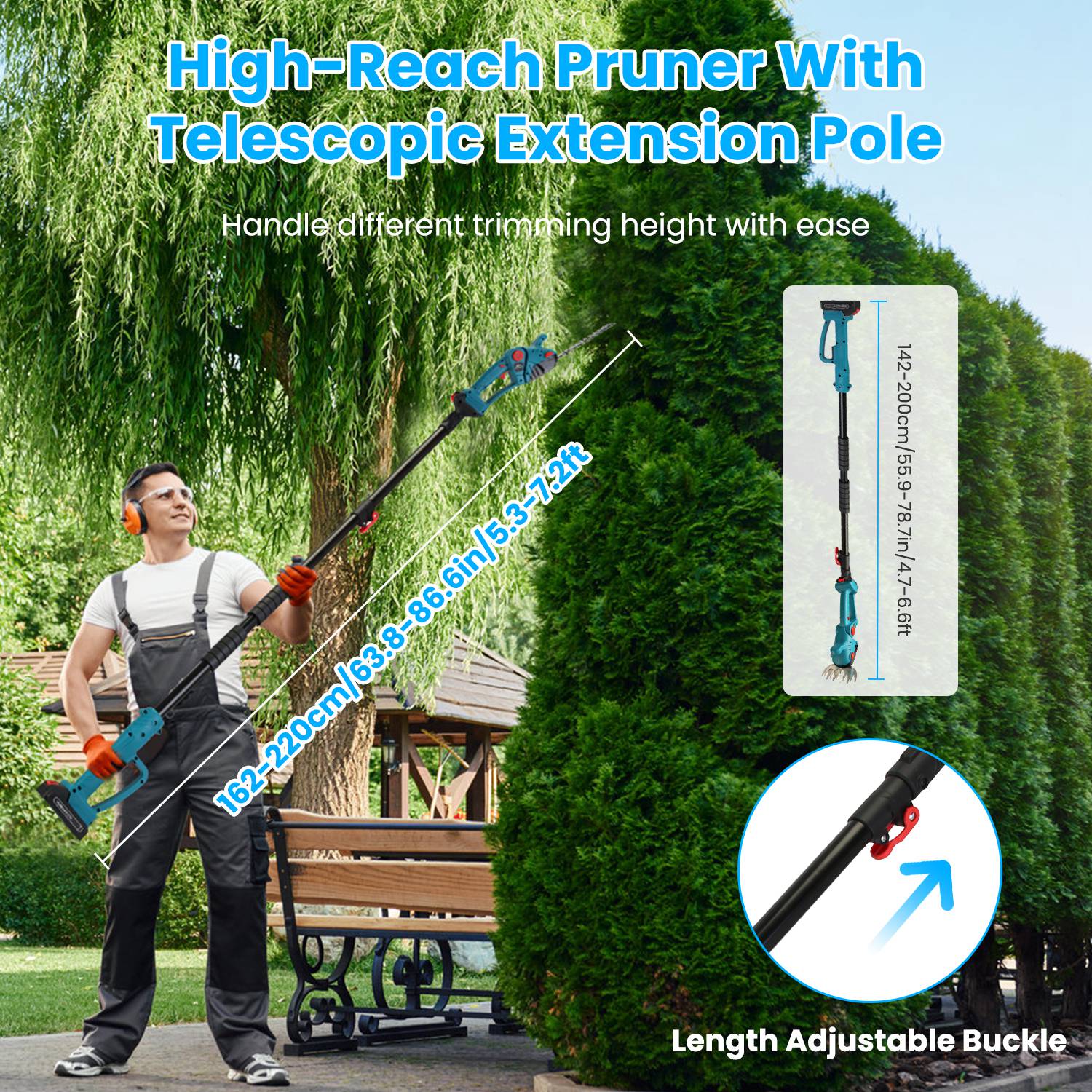 Hedge Shear With Pole Size & Weight(With Battery): 220x12x8cm/86.6x4.72x3.15in; 1200g/2.65lbs(Total Length: 162-220cm/63.8-86.6in/5.3-7.2ft)