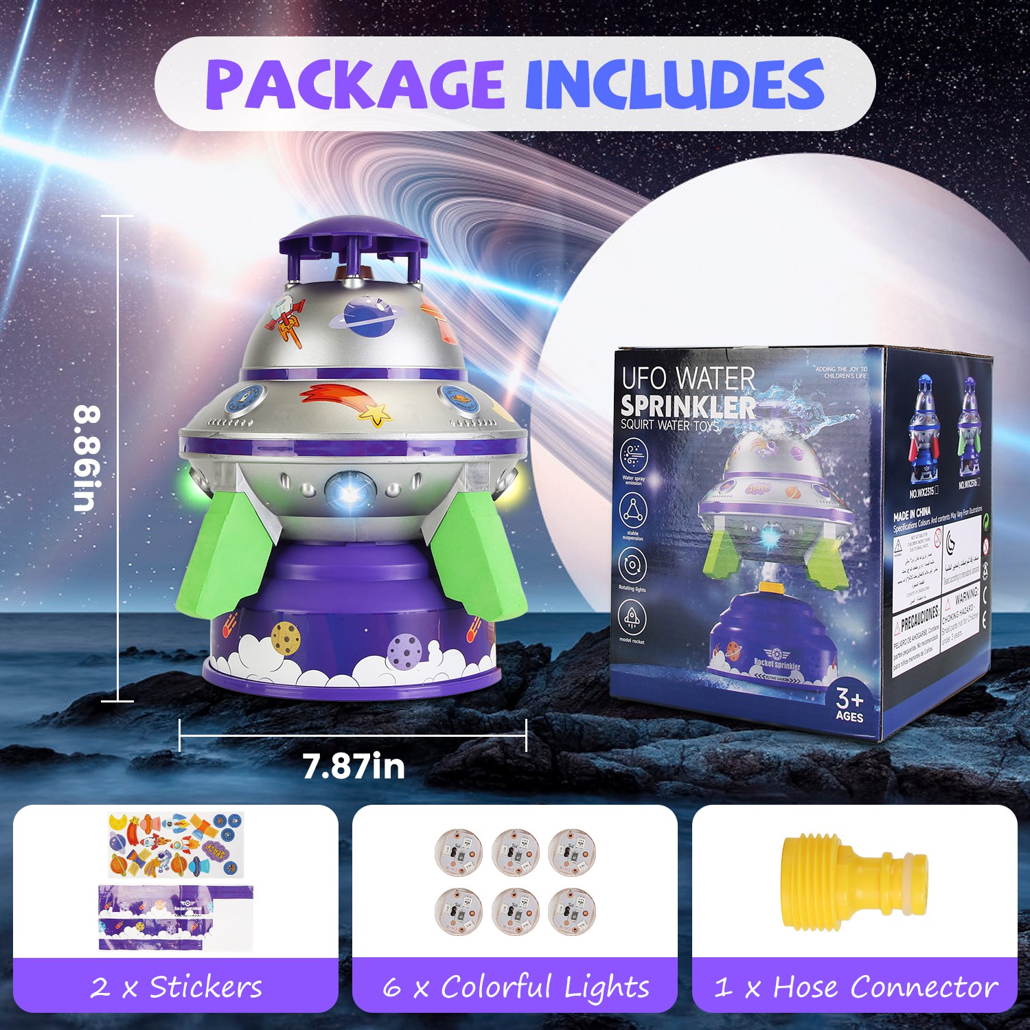 • *360° Rotating UFO Sprinkler*:Designed with captivating UFO theme,our water sprinkler toy will bring a refreshing burst of cool energy on this scorching hot summer. When the 360° rotating UFO head rises,built-in LED lights begin to flash in vibrant colors,creating dynamic water dome and providing endless entertainment during outdoor or poolside activities.