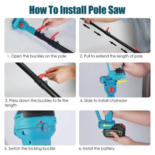*2-IN-1 Pole Saw & Handheld Chainsaw*:Our 2-in-1 electric pole chainsaw is designed to precisely meet the diverse needs in various different work scenarios. You can either use it as a handheld chainsaw to neatly trim the low branches,or conveniently install the extension pole to effortlessly handle high tree limbs with ease,eliminating the danger of using ladder. For your safety during operation,package also includes a pair of gloves and goggles.