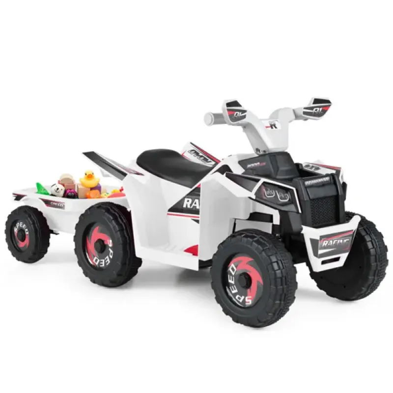 2 In 1 Kids Ride On ATV With Removable Trailer, 6V Electric Quad For Toddlers Ages 3+ White