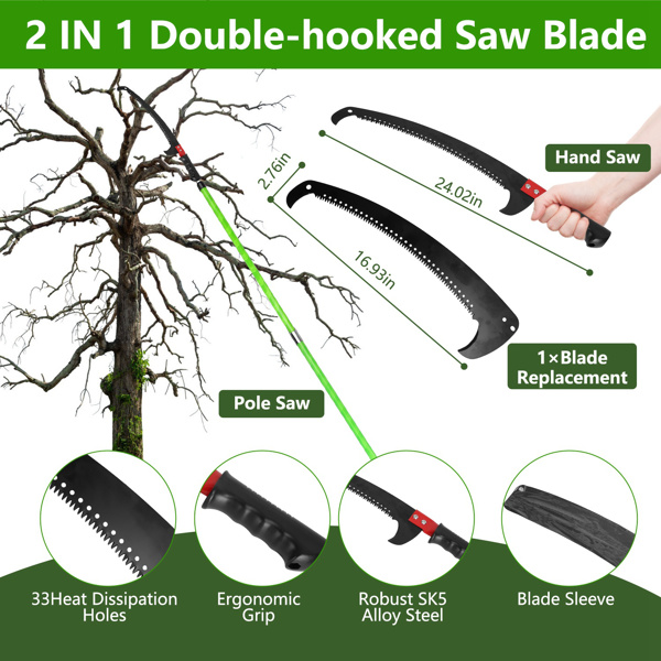Double-hooked Saw Blade: The upper sharpened hook, lower sickle and 3-sided grinding teeth, the double-hooked saw blade serves as both a pole saw attachment and a handheld pruning saw. Able to tackle a range of tree trimming tasks, from high branches using the extension pole to close pruning with the handheld saw. Also feature 33 holes on the surface is designed for good heat dissipation and noise reduction.