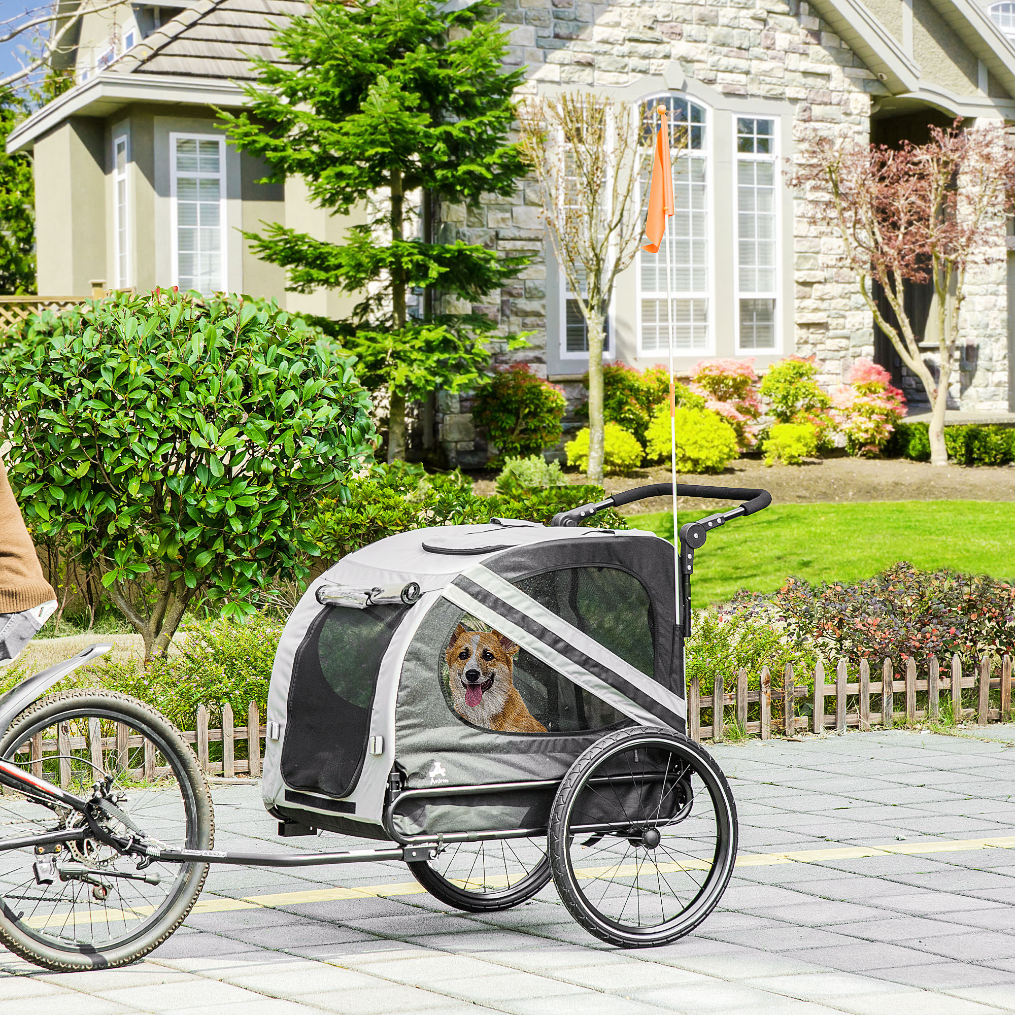 Description: With the weight of a dog on your shoulder or back, your speed slows down and you start to get tired faster from carrying more, but when you're able to walk with a wheeled pet travel system behind you, you're free again. This 2-in-1 PawHut design allows easier pet portability on walks, while also attaching to bicycles, and offering safety features to stay highly visible and keep your furry friend safe. With a tall red flag and a reflector, you can alert those around you from multiple directions. Features: - 2-in-1 design can be used as a trailer and a pet/cargo trolley for walking - Water, weather, and fade resistant fabric for outdoor strength in the sun, wind, and rain - Safety flag and reflector for alerting others from multiple directions - Zipped front and back door ensures easy access - Mesh screen at the front, top, and side ensures good ventilation - Pets can peek head through skylight and feel the wind - A safety leash is included for securing your pet - Quick-release wheels for easy storage - Assembly required Specification: - Color: Grey, Black - Material: Steel, Oxford Fabric - Overall Dimension: 55" L x 28.5" W x 42.5" H (Trailer), 40.5" L x 28.75" W x 42.5" H (Stroller) - Internal Dimension: 31" L x 21.75" W x 24.75" H - Front Door Dimensions: 13.75" L x 17.25" W - Back Door Dimensions: 15" L x 17.75" W - Skylight Dimensions: 15.25" L x 13.5" W - Front Wheel Dimensions: 8" Dia. - Rear Wheel Dimensions: 20" Dia. - Suitable Bike Wheel Diameter: 24"-28" - Weight Capacity: 44 lbs. - Body Size: 21.25" L. - Item Label: D00-144V01GY Package Includes: - 1 x Dog Trailer - 1 x Instruction Manual.