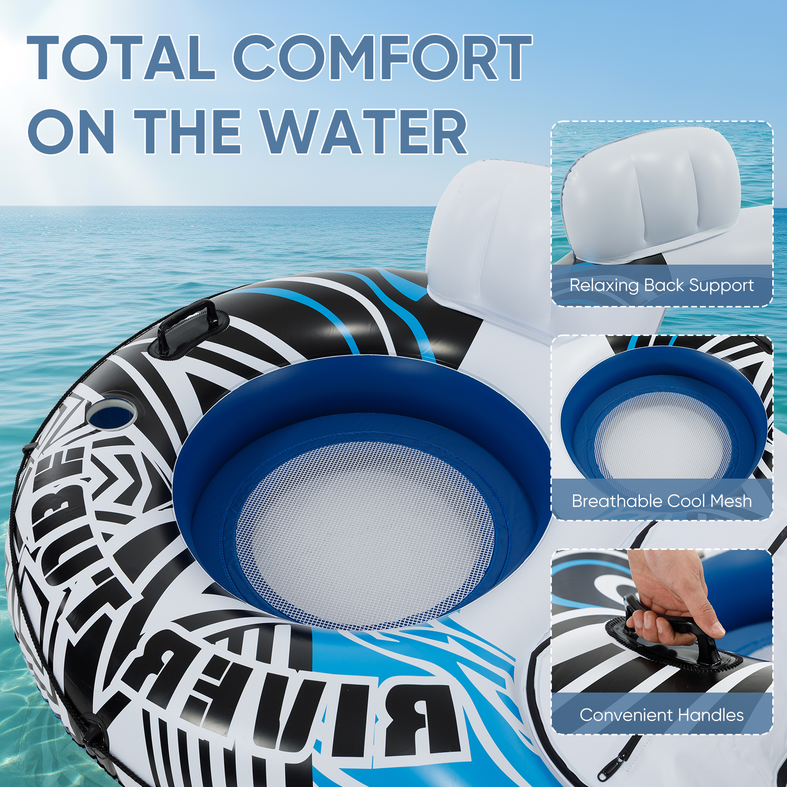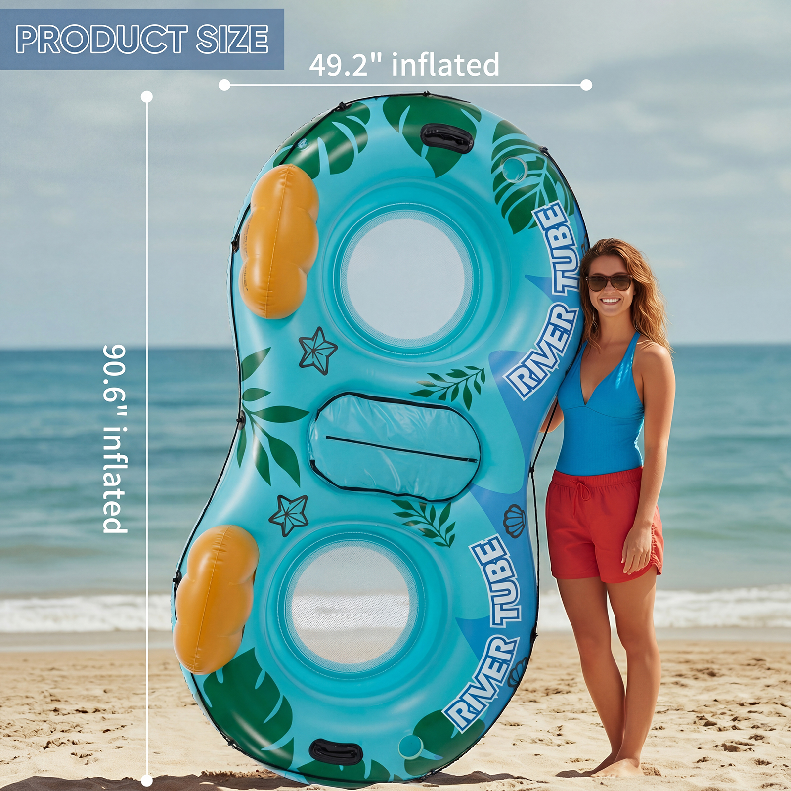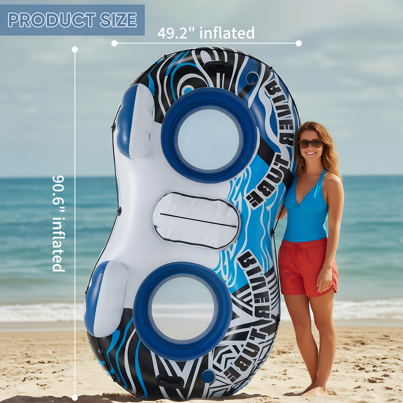 90.6×49.2-inch oversized inflatable tube, capable of accommodating 2 adults for travel together; the cooling mesh bottom design keeps you cool even under the sun, and makes lying down more comfortable.