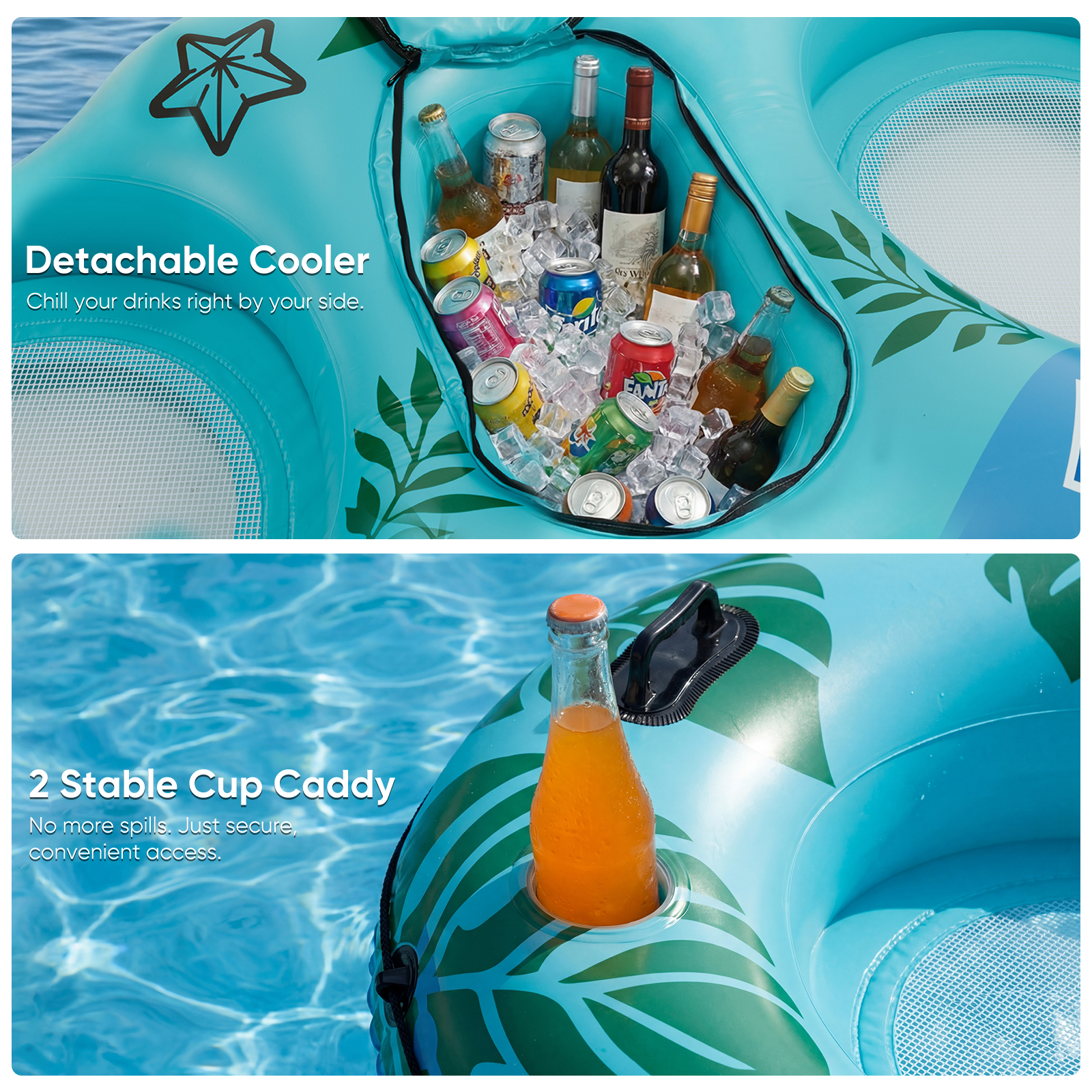 It comes with 2 integrated cup holders + 1 detachable cooler box. It is easy to place beverages. At the same time, it provides ample storage space to store essential items for water activities, making it more convenient for floating rest.
