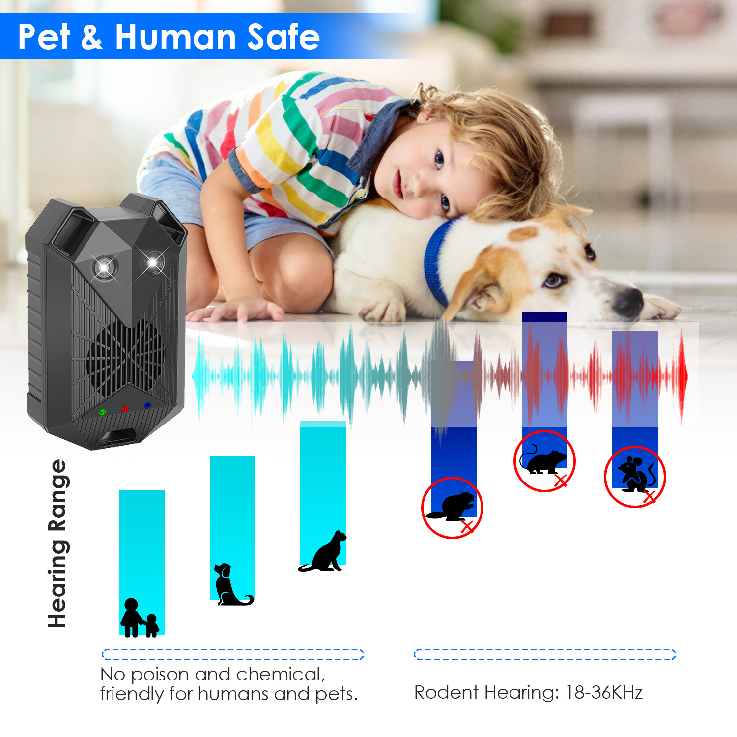 *Safe For Human & Pet*:The rat deterrent effectively chases away nasty mice running around in the kitchen and basement,squirrels nesting in the car,mice biting the car wires etc.. The ultrasound will do no harm to humans,children,mothers,babies and all house hold electronics. No poison and chemical.