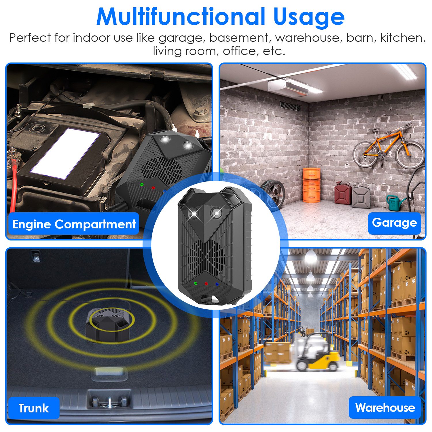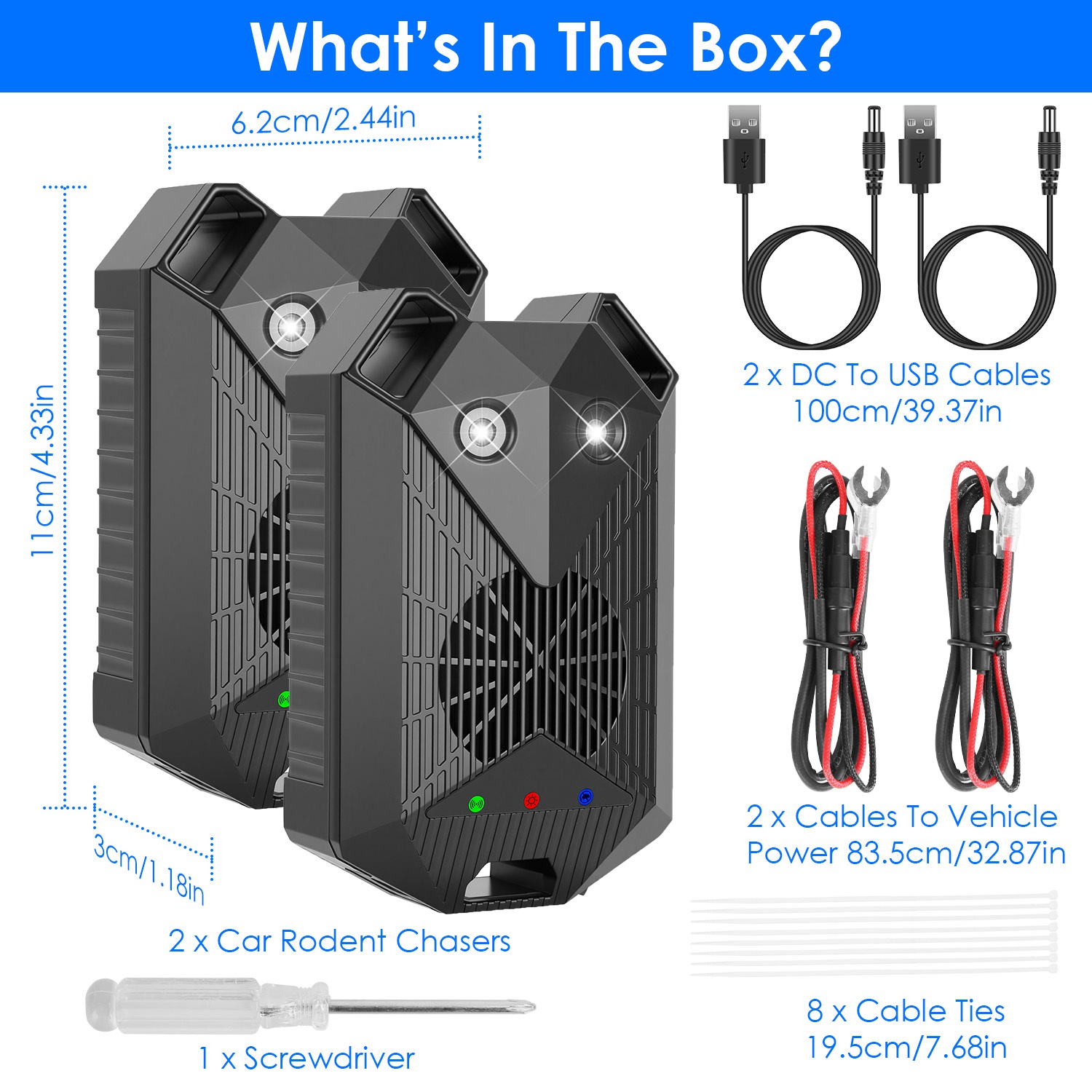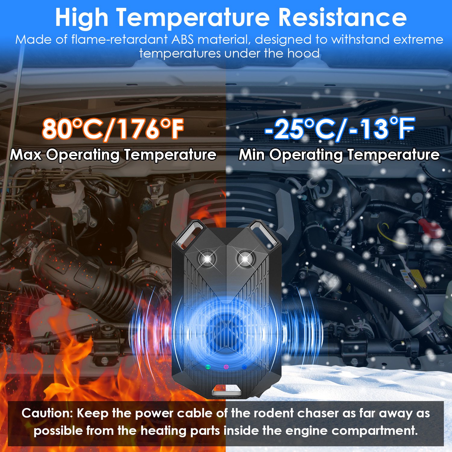 *Professional Rodent Repellent*:Rodents are very sensitive to environmental changes,especially to light and sound. The strong white light can stimulate the retina of mice,making them feel uneasy. And the auditory system of rodent is very developed and sensitive to ultrasound. This under hood rodent repeller combines 18-36KHz fluctuating ultrasound waves and 2 LED strobe lights to effectively prevent rodents from invading your car,RV,truck,garage and other places.