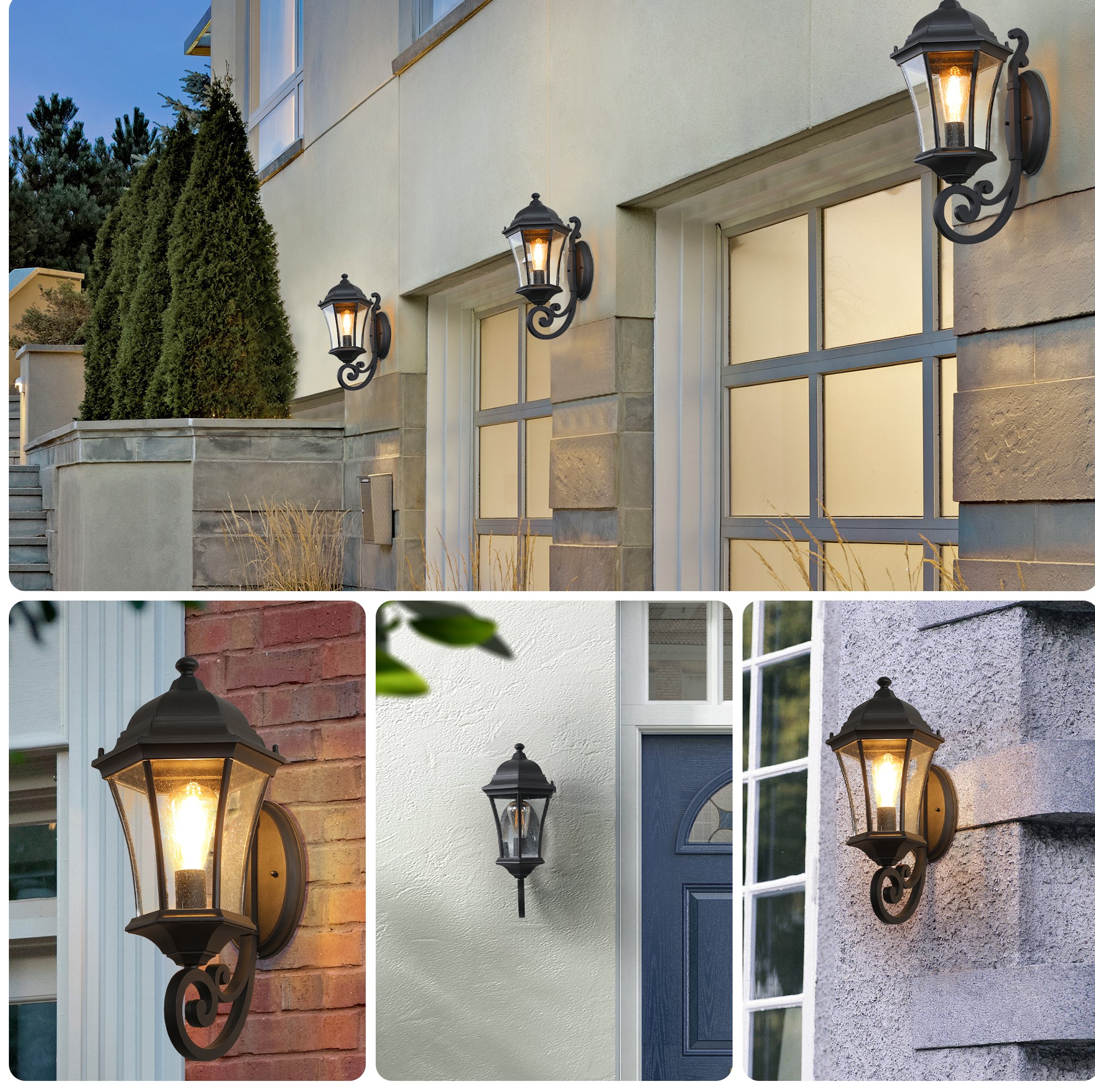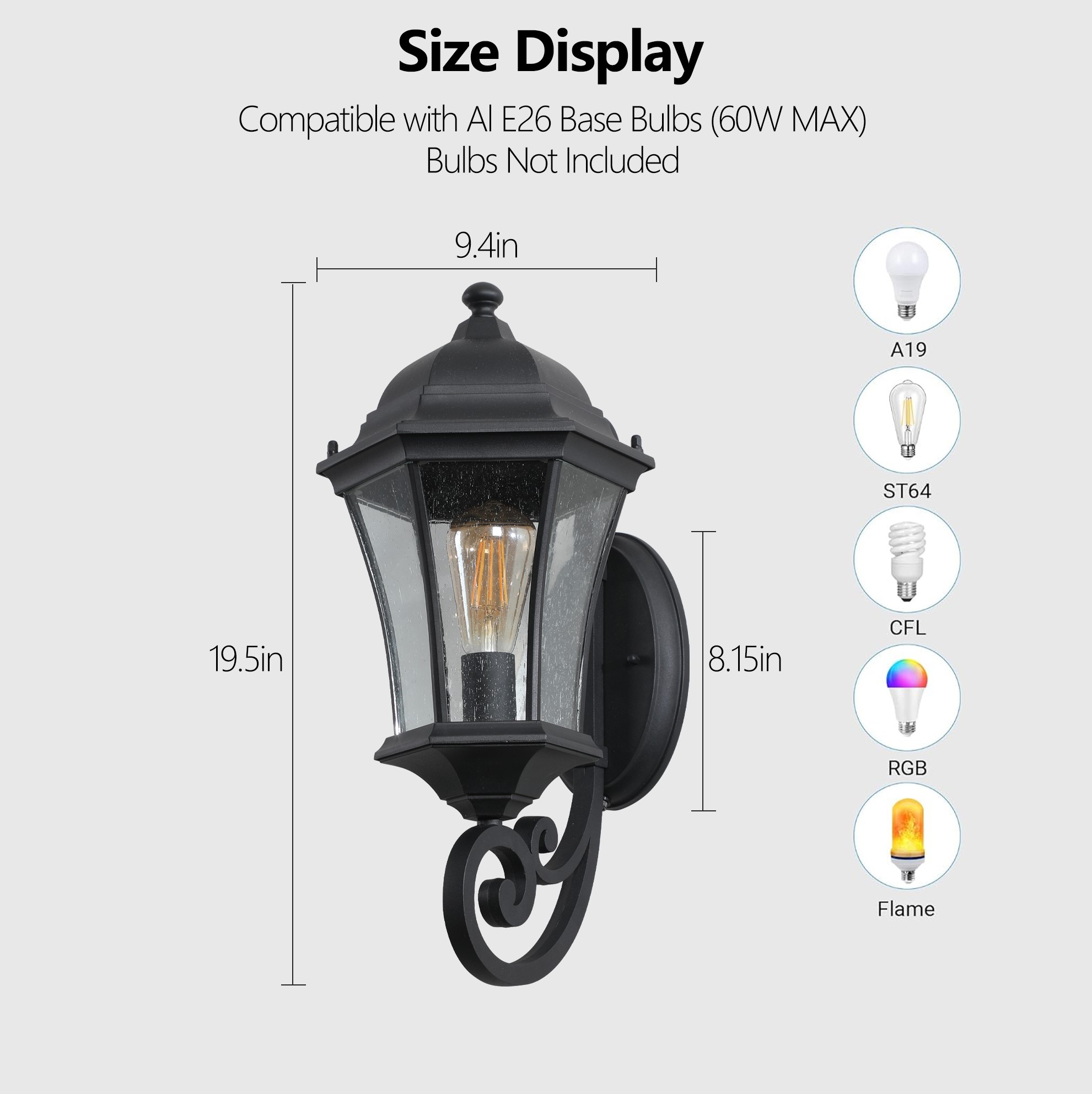 RETRO STYLE DESIGN - Black finish, reliable quality aluminum. Frosted glass panels allow the bulbs to be seen. Traditional wall light style.WIDE APPLICATION - This retro styled matte black finish post lights can be a beautiful addition to your house, porch, patio, walkway, doorway, garden, garage or any other exterior and interior places.BULB REQUIREMENT: Requires1 x E26 base 60W bulb (incandescent, LED, or CFL). Bulb not included.EASY INSTALLATION: Hard wired. This outdoor wall mount light includes all mounting hardware for quick and easy installation.