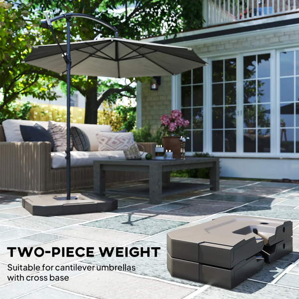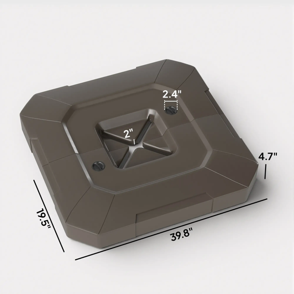Features: - Two piece weights for cantilever offset umbrellas with cross base - Weighs up to 176 lbs. when filled with water, 231 lbs. when filled with sand-and-water mix - Made of weather-resistant and anti-aging HDPE plastic for outdoor use - Fill port makes bases easy to fill - Fit cross base bars within 39.4" in length - Stack the plates together for a compact size when not in use - Cross base not included Specification: Color: Brown - Material: HDPE - Overall Dimension: 39.8" L x 39.8" W x 4.7" H - Each Plate Dimension: 39.8" L x 19.5" W x 4.7" H - After Filling Weight: 176 lbs. (Water), 231 lbs. (Sand and Water Mix) - Central Hollow Height: 2" - Fit Cross Base Bar Length: 39.4"