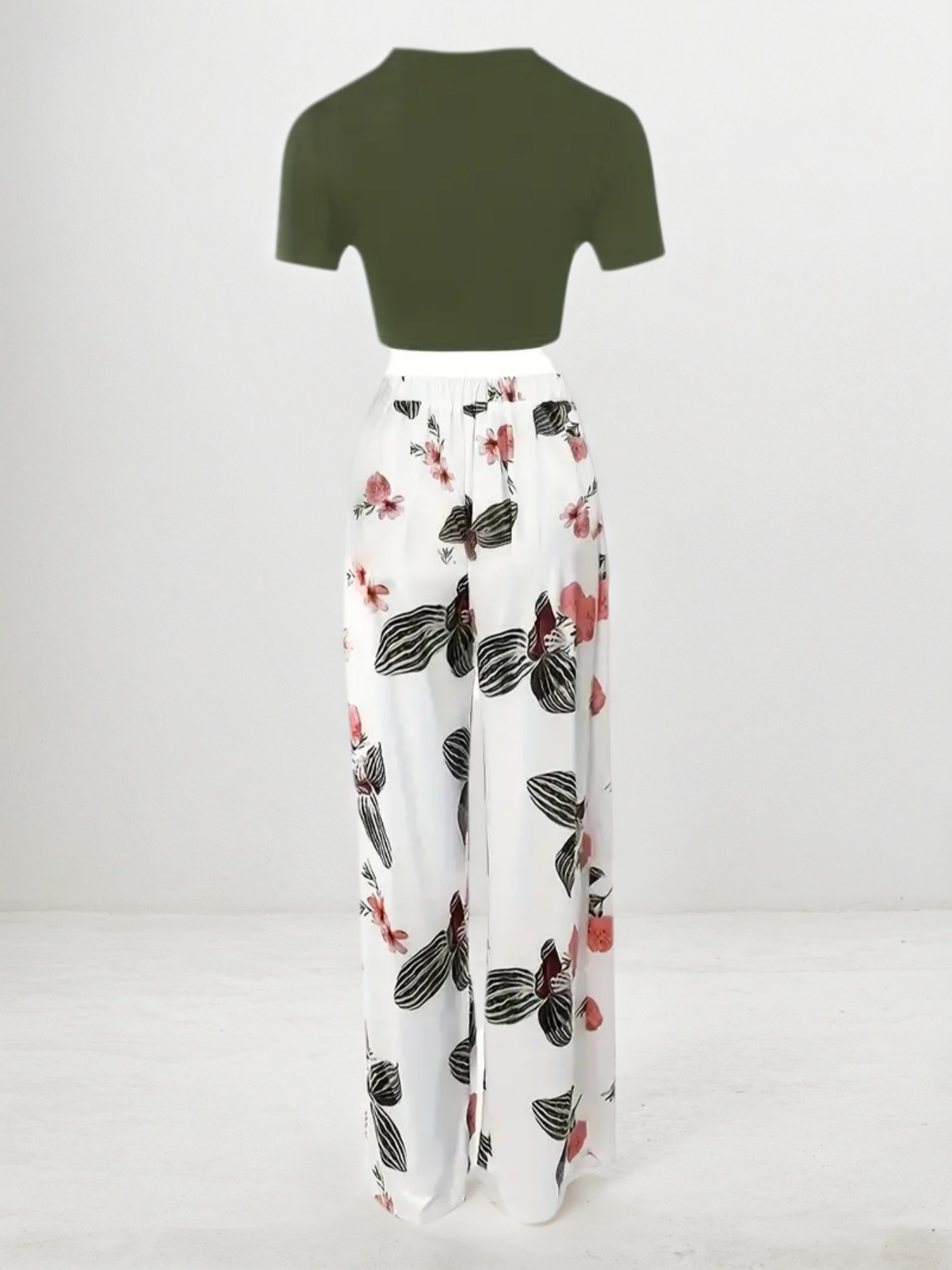 2 Pieces Of Women's Casual Sportswear, Striped Short Sleeved Jacket And High Waisted Wide Leg Pants Set, Brown, White And Black, Washable, Randomly Printed, Round Neck