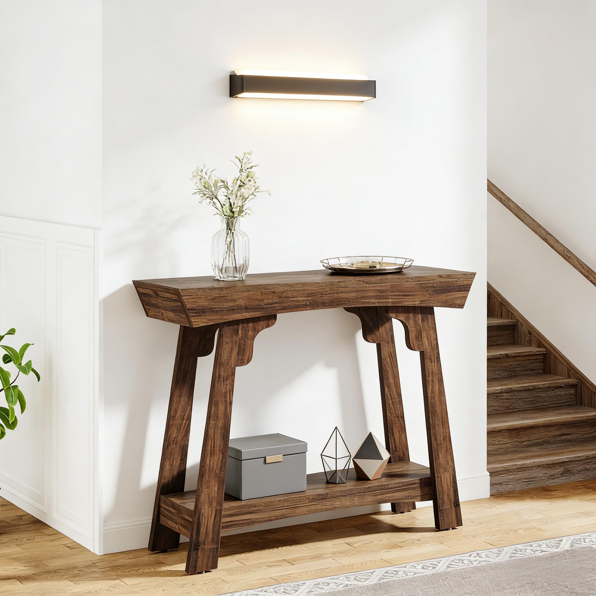 Important Reminder!!! 1) Attention: All products in our store do not support Canada self pickup ordering. Please do not create shipping labels for Canada. Our American products do not support self pickup to Canada 2)We do not ship to Alaska, Hawaii, US protectorates (e.g., Puerto Rico), P.O. boxes, or APO/FPO addresse 3)We don’t accept non-defective remorse returns 2-Tier Storage Space - Offering two levels of storage, this 41.3-inch long entryway table provides ample space for your decorative items like a vase or table lamp on the top shelf, and practical storage like baskets on the bottom shelf, perfect for bags and keys. Chic Design - Featuring a rustic brown finish with a simplistic silhouette, this console table exudes a farmhouse charm that will undoubtedly add a hint of charisma to your entryway. Broad Applicability - With an 11.8" depth, this wooden sofa table fits snugly into narrower hallways, entryways, or the space behind a couch. It takes up minimal room while still offering functional storage, making it a perfect fit for your entryway or living room. Sturdy Construction - Utilizing 1.8" thick high-quality particleboard, this console table provides solid backing for your objects and ensures long-lasting usage. Adjustable feet help in maintaining stability on slightly uneven floors and protect your flooring from scratches. Simple Assembly - The parts are clearly marked, and the instructions are straightforward for a hassle-free assembly. Please don't hesitate to reach out to us if you have any questions.