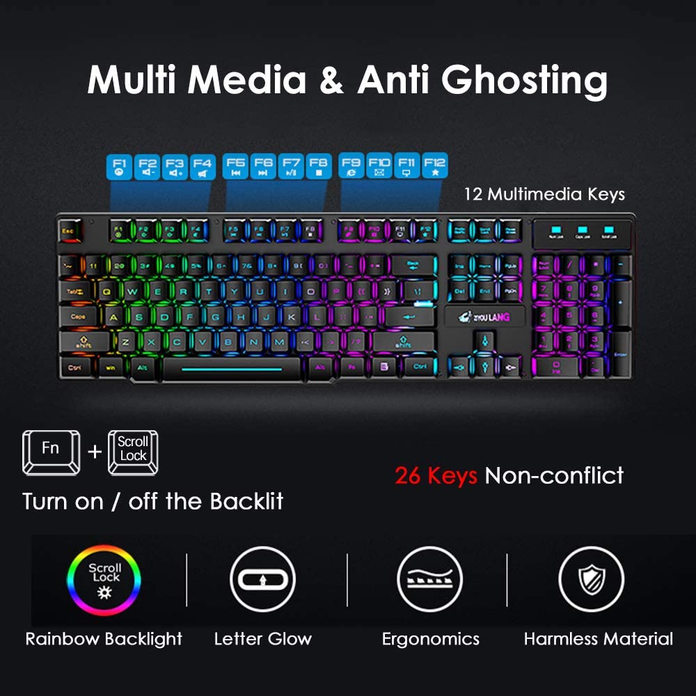 【Rainbow LED Backlit】Amazing rainbow backlit effect, giving you an excellent visual experience in night operation. The keyboard backlight can be adjusted, Fn+Scroll lock: turn on/off the backlight, Fn+PgUp: the light becomes brighter. Fn+PgDn light becomes darker.