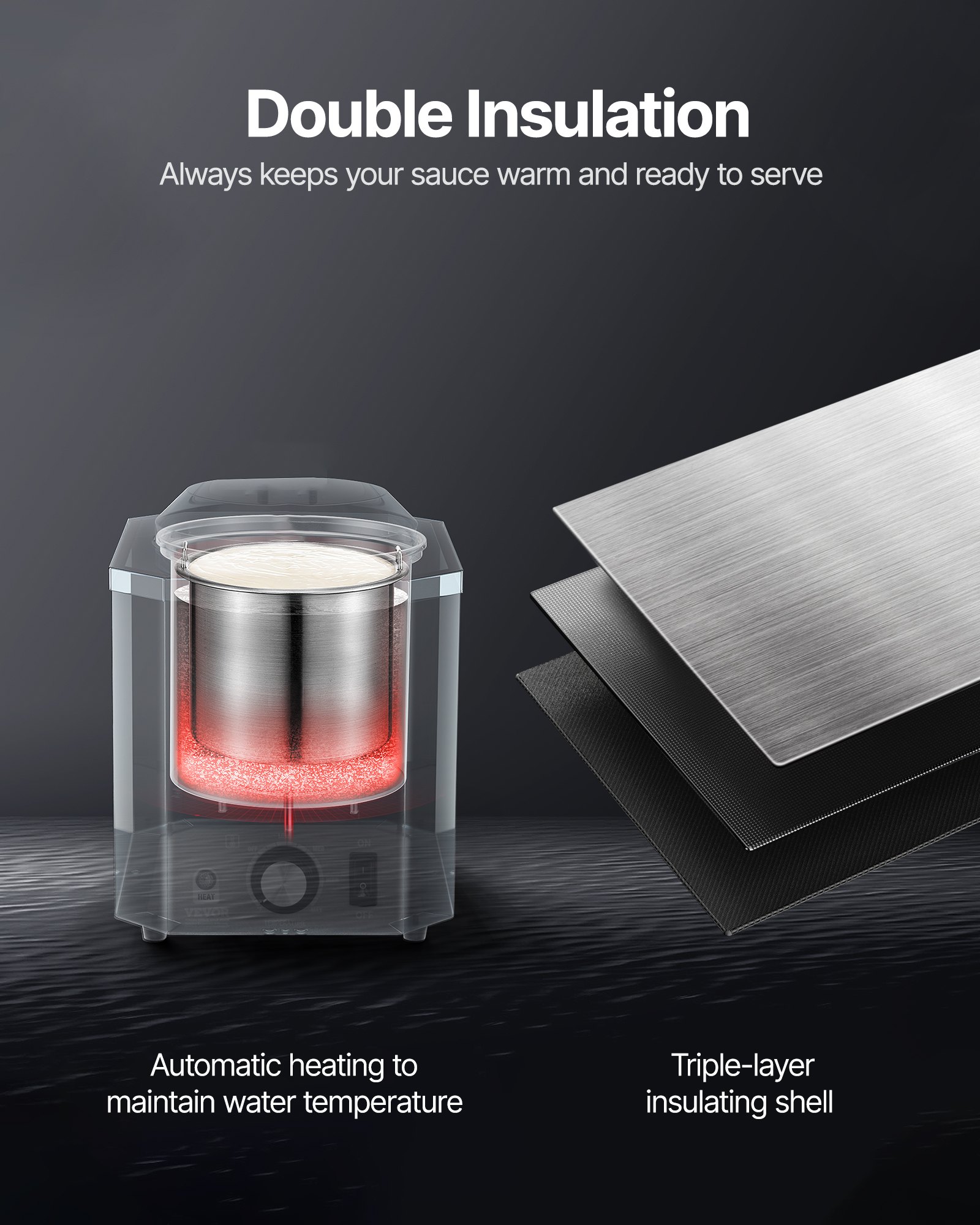 High Capacity: With a food basin capacity of 2.4L/0.6 gal and a water tank capacity of 3L/0.8 gal, this commercial sauce warmer is sufficiently equipped to meet everyday demands. It allows you to heat or melt your choice of toppings