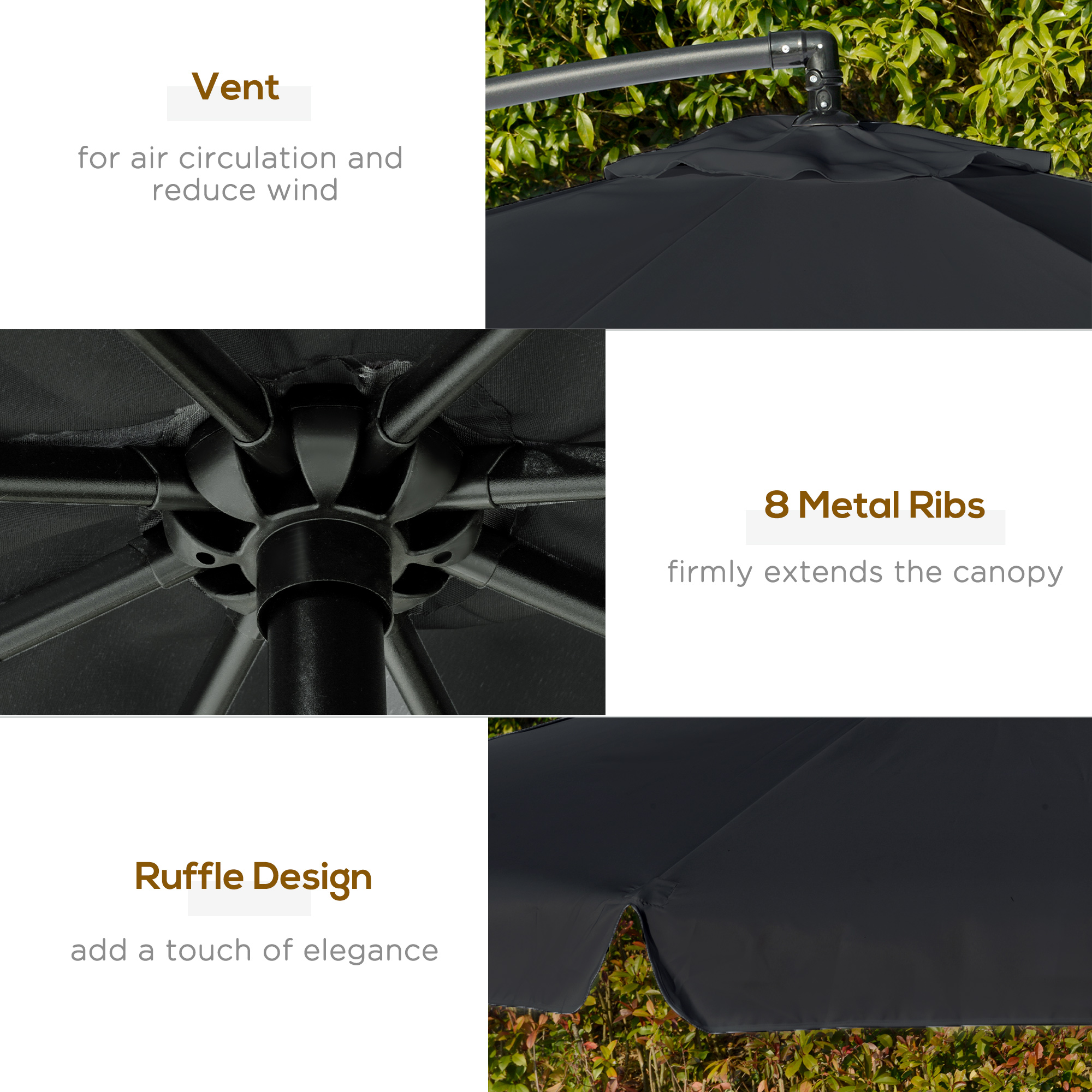 This outdoor parasol is a piece you'll love having outside. The modern overhanging design means you can keep shaded anywhere, without the hassle of a central pole getting in your way. The core structure is made from metal, so it's tough and sturdy, connecting to the garden umbrella parasol with eight ribs for support. It can provide plenty of shade, keeping you cool on hot summer days but also bringing style into your garden and beyond.