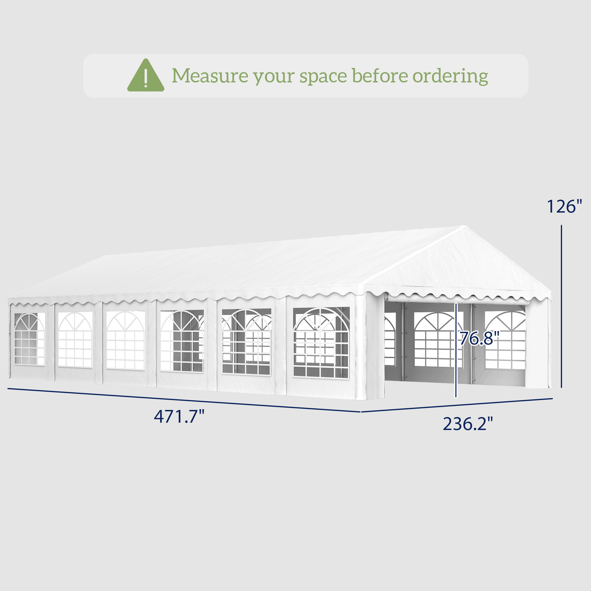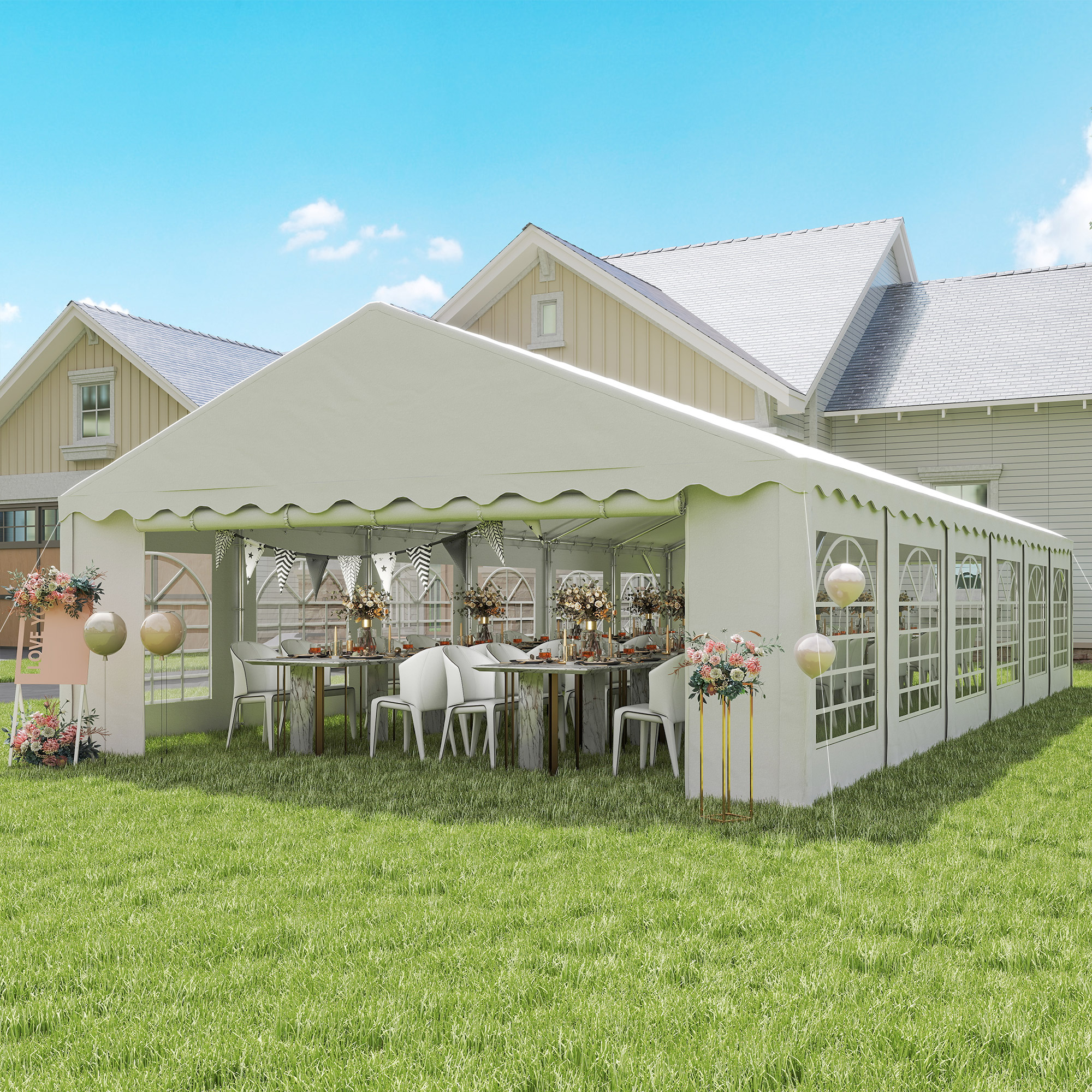 Transform any outdoor space into a majestic venue with the [BRAND NAME] 20' x 40' outdoor canopy tent with sidewalls. Spacious enough to comfortably host up to 80 guests, this event tent features a soaring 10.5' ceiling and robust corner support beams for added stability. Enjoy enhanced wind resistance thanks to galvanized steel frames and ground stakes, which are great for any wedding tent or outdoor party tent needs.