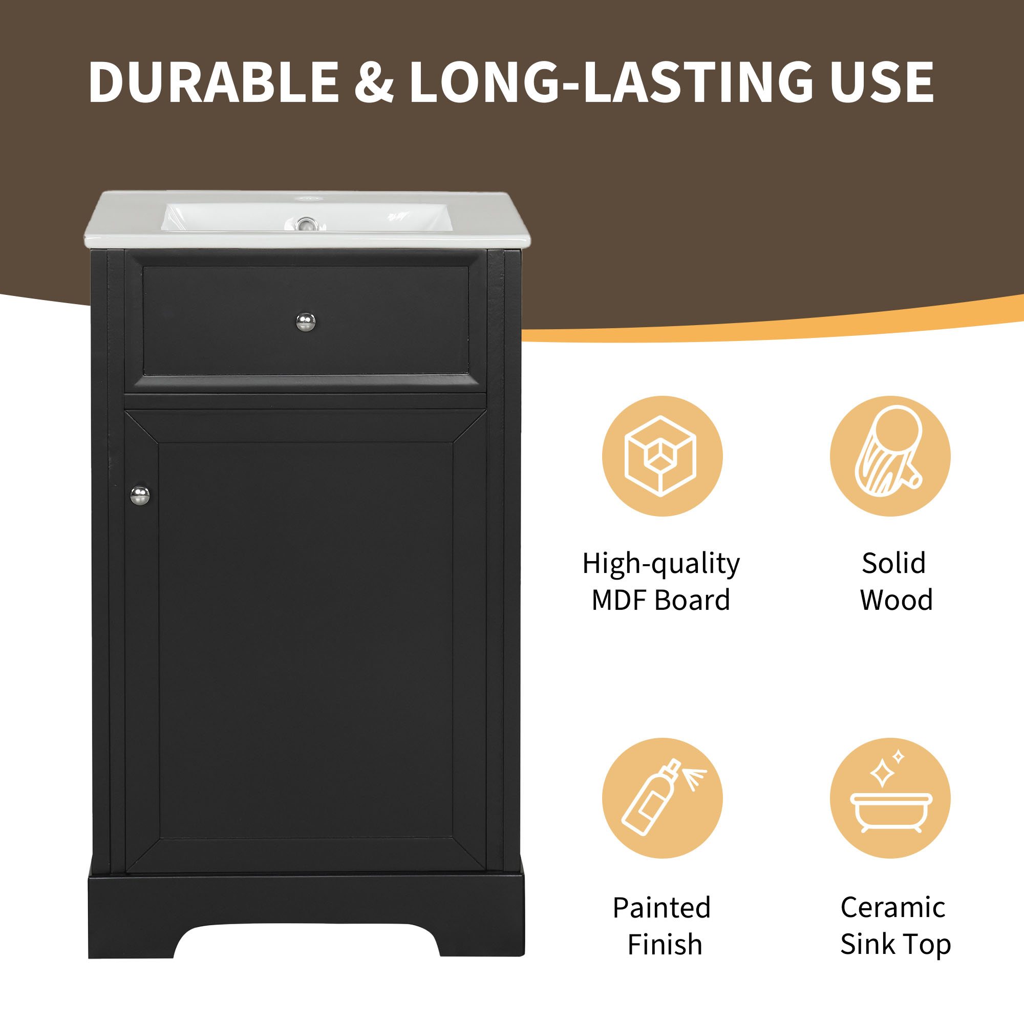 1. 20" Bathroom Vanity with Sink 2. High-quality MDF Board & Ceramic Sink & Painted Finish 3. Cabinet with Door & Storage Rack & Adjustable Shelf 4. One Package Details 1. Soft Closing Door 2. Round Handle 3. Stainless Steel Hinges