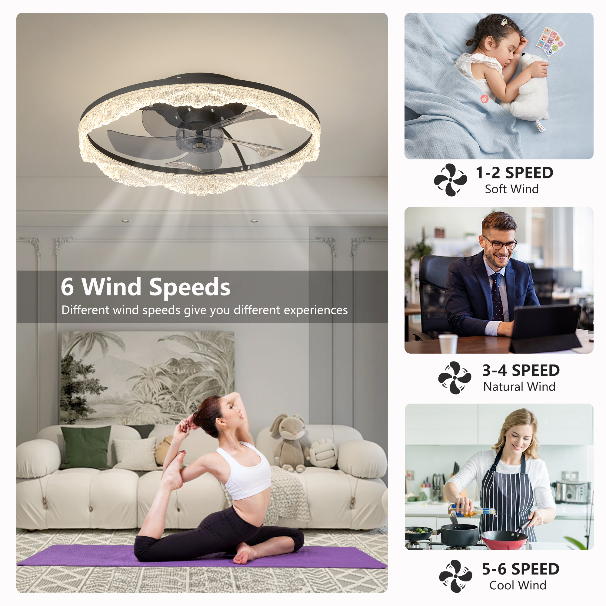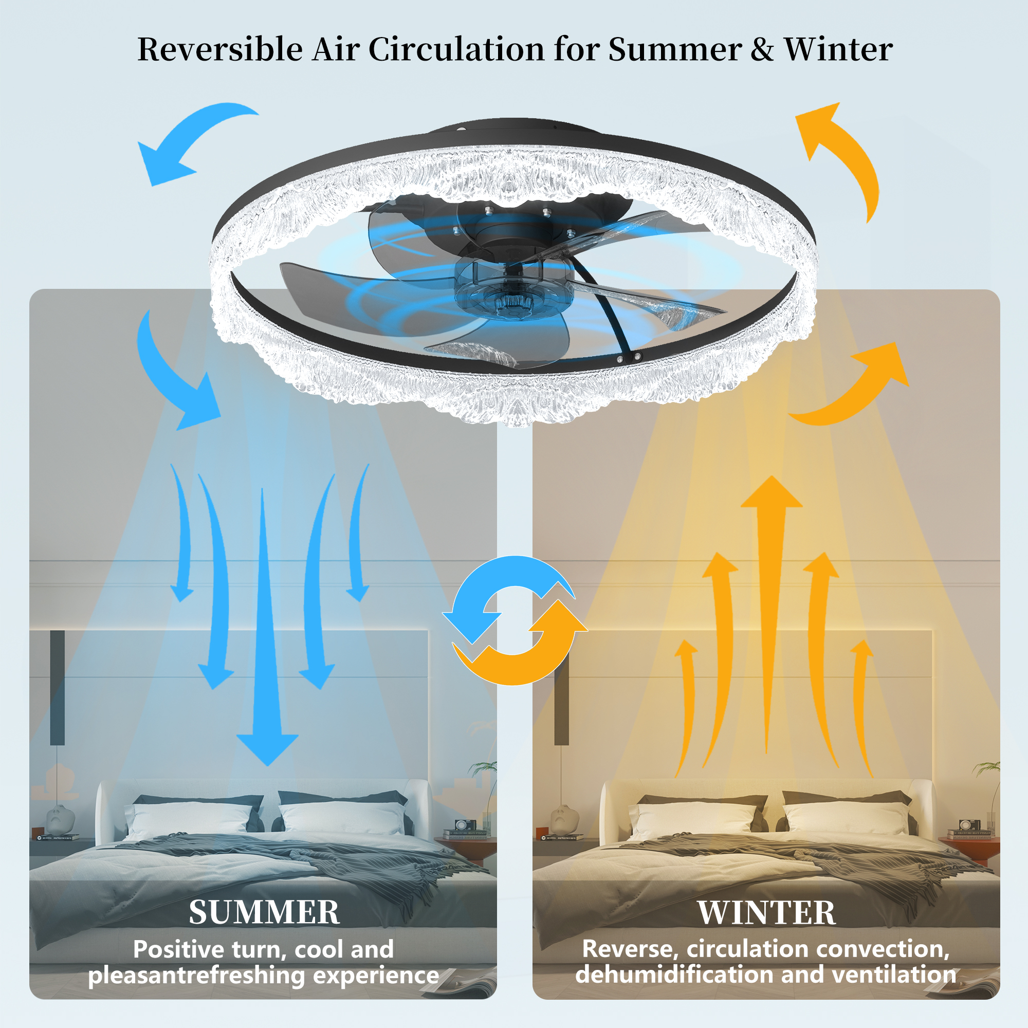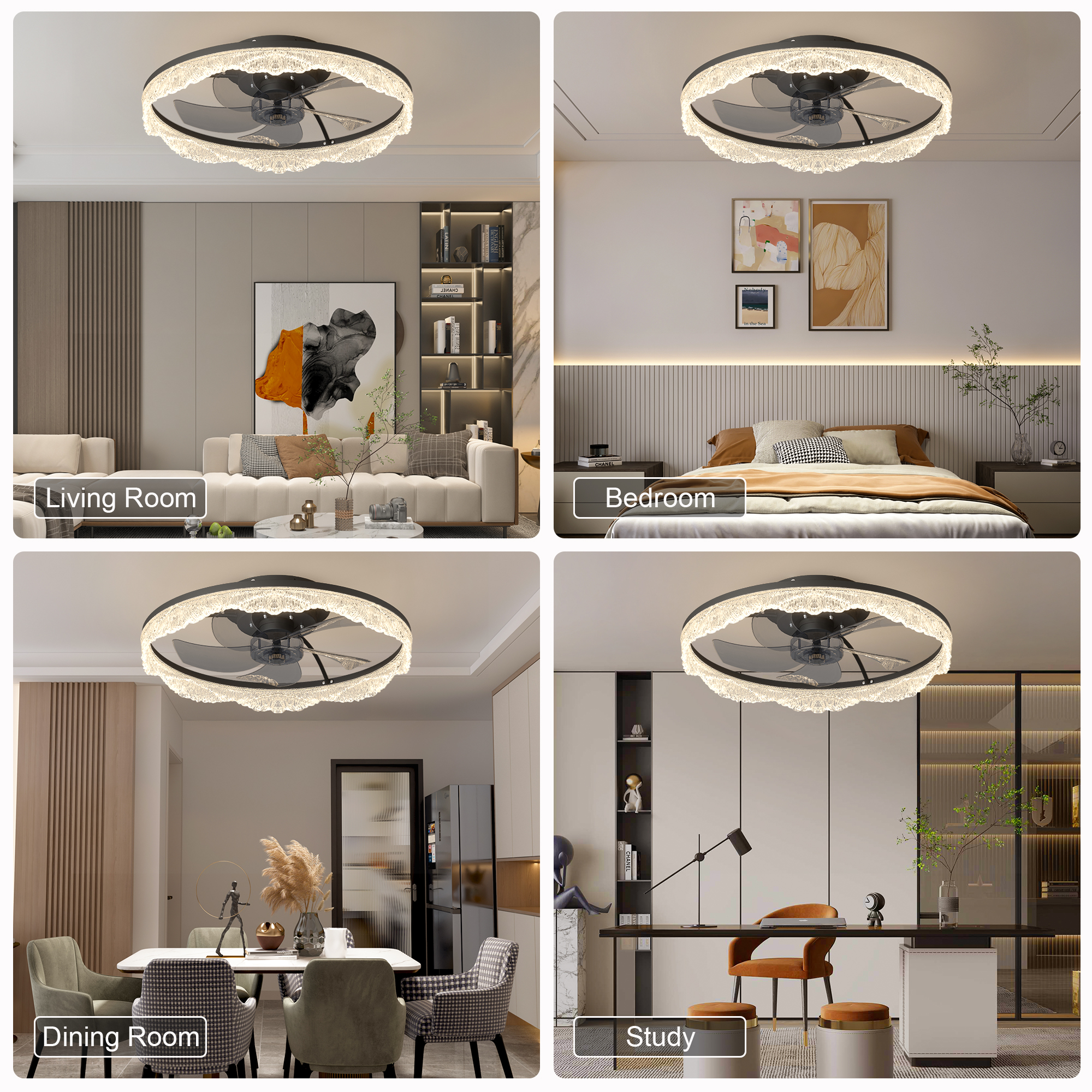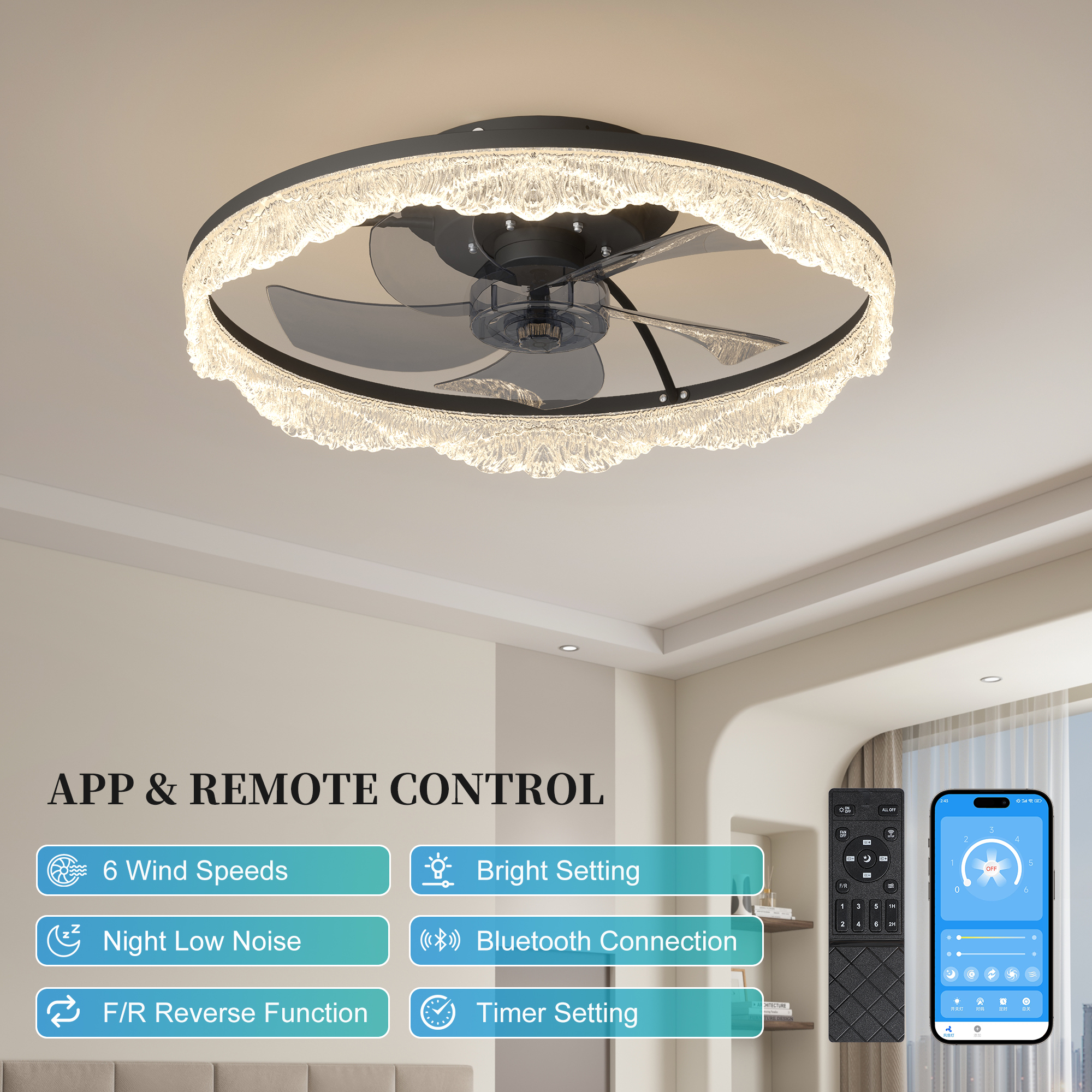 2-in-1 Modern Design – Lighting Meets Airflow: This ceiling fan light combines a powerful fan and elegant LED lighting in one sleek design. Perfect for modern homes looking to save space without sacrificing style or function.Decorative Acrylic Light Ring: adding a touch of luxury and sophistication. When lit, it produces a soft, ambient glow that's both eye-catching and cozy.Hidden Blades for a Sleek, Minimalist Look: Equipped with invisible fan blades made from high-quality ABS, the fan blends seamlessly into the ceiling fixture. Enjoy a clutter-free look while still benefiting from strong airflow.Whisper-Quiet Operation with Remote Control: Enjoy silent comfort with a quiet motor and easy-to-use remote control. Adjust fan speed, light brightness, and power with the touch of a button-no noise, no hassle.Ideal for Low Ceilings & Stylish Interiors: With its flush mount, low-profile design, this fan light is perfect for rooms with lower ceilings. Whether it's a bedroom, living room, dining area, or office, it enhances the space with both function and flair.