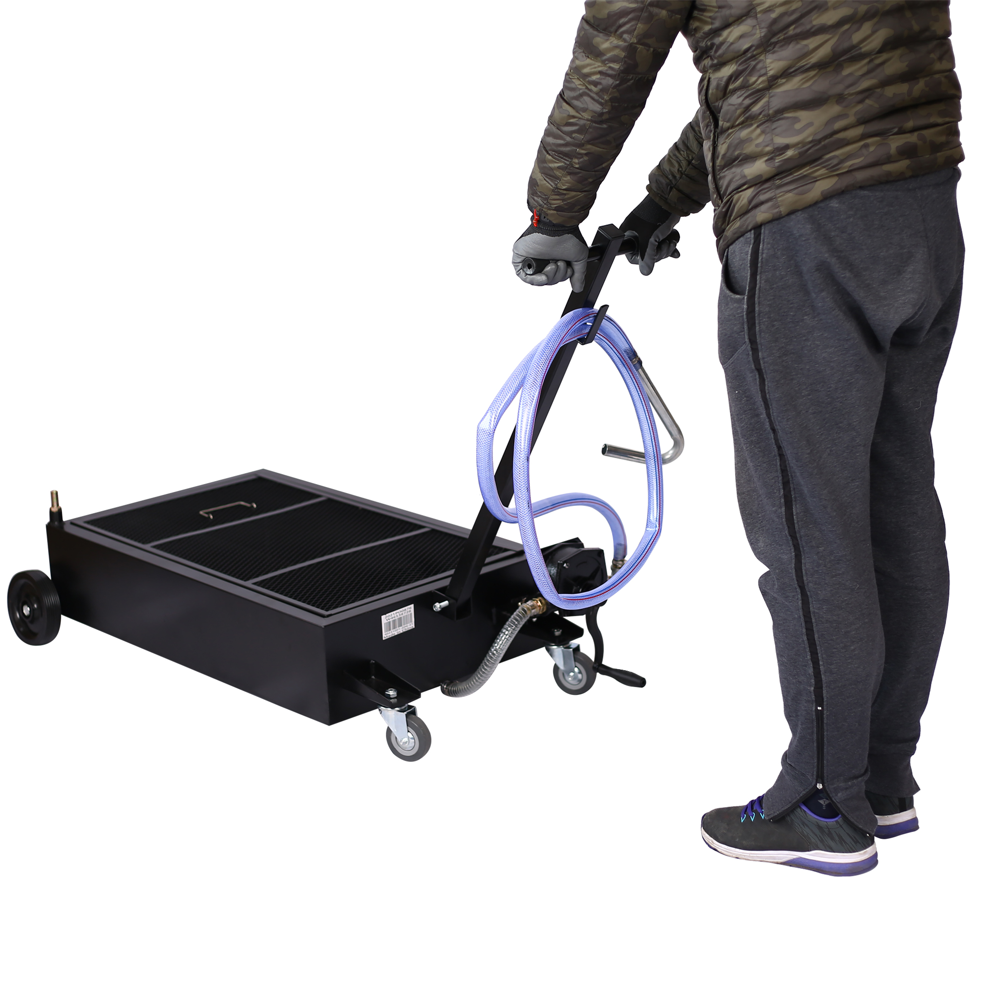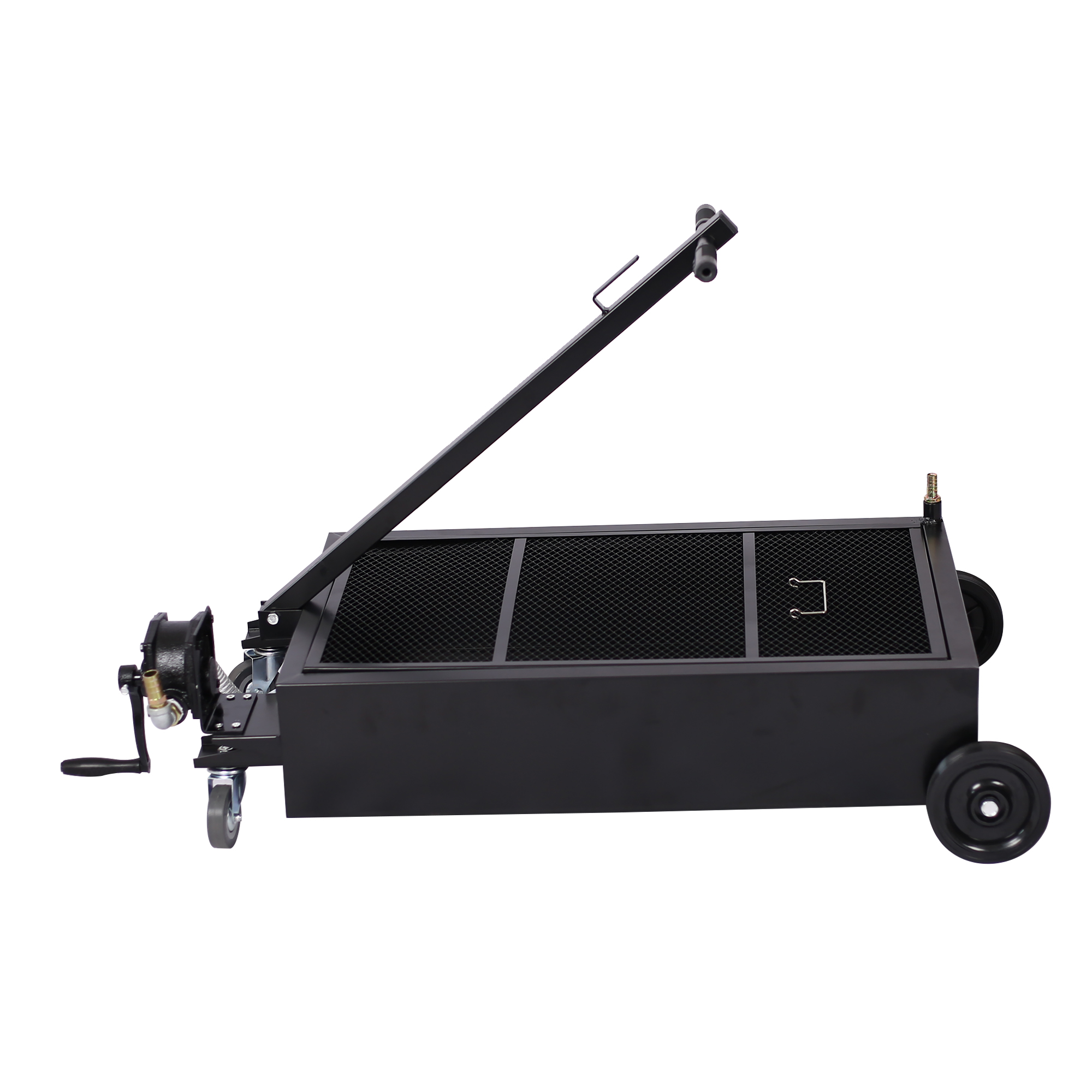 Capacity: 20-Gallon. Could hold oil up to 20 gallon, which is perfect for large jobs Pump Revolution Speed: 18n/min. Pump Flow Volume: 18L/min. Evacuation Hose Length: 7ft. Function: It is made from high-impact polypropylene, which prevents the drain from rust & corrosion, dent and lightweight at the same time. Great for: Low-profile Applications Such as Trucks, SUVs, and a Handful of Other Equipment Suitable Fluids: Manual Pump Sllows you to Quickly Drain Oil, Anti-freeze, and Other Fluids. Long-reach T-handle makes drain easy to position under vehicles and great for convenient storage, movement and pulling Our oil drain pan is constructed with two 6'' wheels and two 3'' swivel casters for smooth operation and movement.
