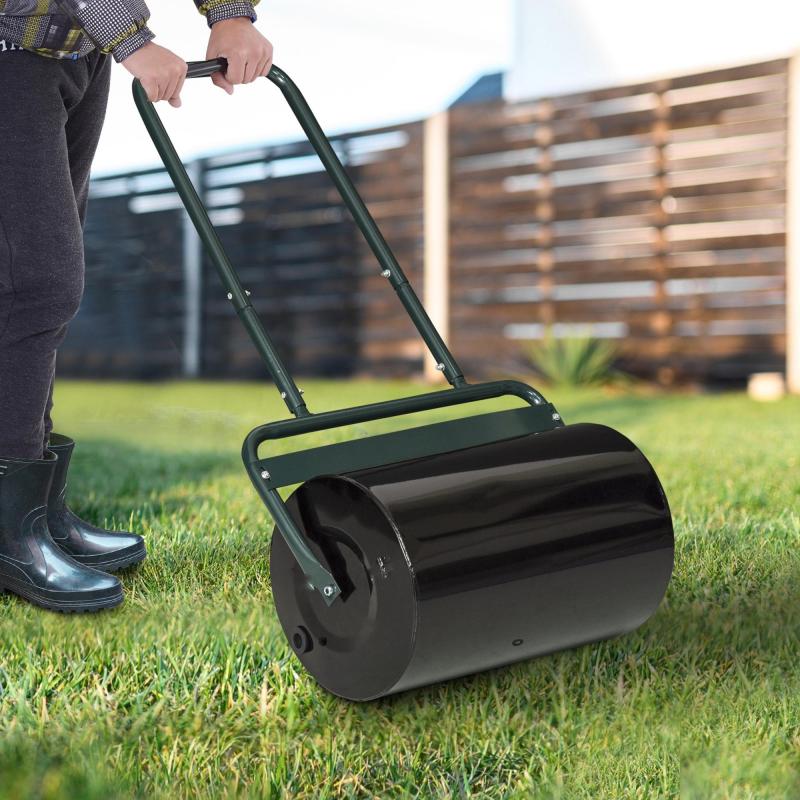 For an effective way of flattening the top of your lawn after sowing seeds and more, check out this drum roller from [BRAND NAME]! Our goal with this lawn roller is to make your time in the garden as easy as possible. That's why we designed the lawn roller to be easily pushed and pulled with its comfortable U-shaped handle. Furthermore, you can add either 10 gallons of water or sand to the sod roller, so you can control the weight and material to use.
