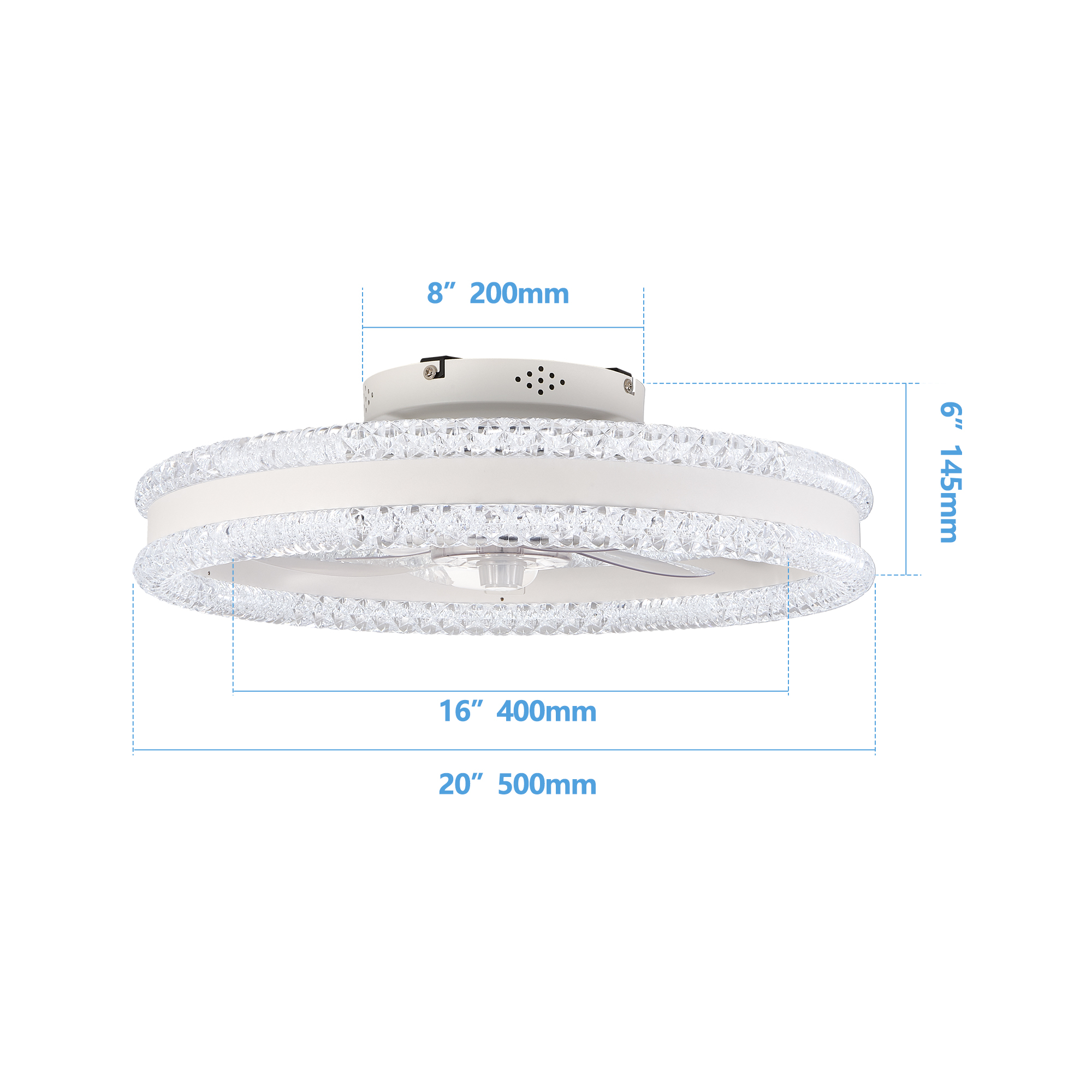 Elegant Double Crystal Ring Design: Features a unique dual-ring LED light with faceted crystal-style acrylic edges. The luxurious design creates a stunning light reflection, turning your ceiling into a visual centerpiece-perfect for modern and upscale interiors.Hidden ABS Blades for Seamless Aesthetics: Equipped with durable, retractable ABS fan blades in a sleek black finish. The hidden-blade structure ensures strong airflow without compromising the lamp's elegant look, ideal for design-conscious spaces.Dimmable LED Light with Multiple Color Temperatures: Offers soft, adjustable lighting with warm, neutral, and cool white color options. Easily set the mood for relaxation, reading, or entertaining using the included remote control.Whisper-Quiet Motor & Remote Operation: Powered by a low-noise motor that ensures peaceful comfort-day or night. Control fan speed, light color, and timer functions all from the convenience of your couch or bed.Space-Saving Flush Mount for Modern Living: The low-profile flush mount design is ideal for rooms with low ceilings such as apartments, bedrooms, living rooms, and offices. Blends form and function beautifully for today's minimalist and luxury spaces.