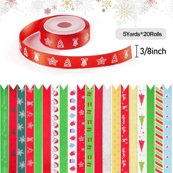 20 Rolls 100 Yards Christmas Ribbon For Gift Wrapping, 3/8 Inch Printed Christmas Grosgrain Ribbon, Christmas Ribbon For Gift Wrapping Crafts DIY Holiday Xmas Decorations
