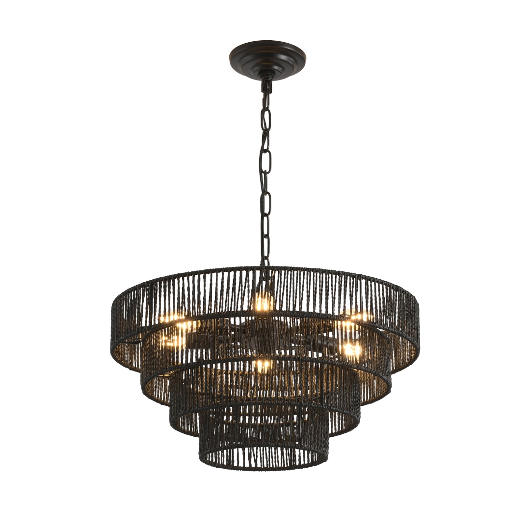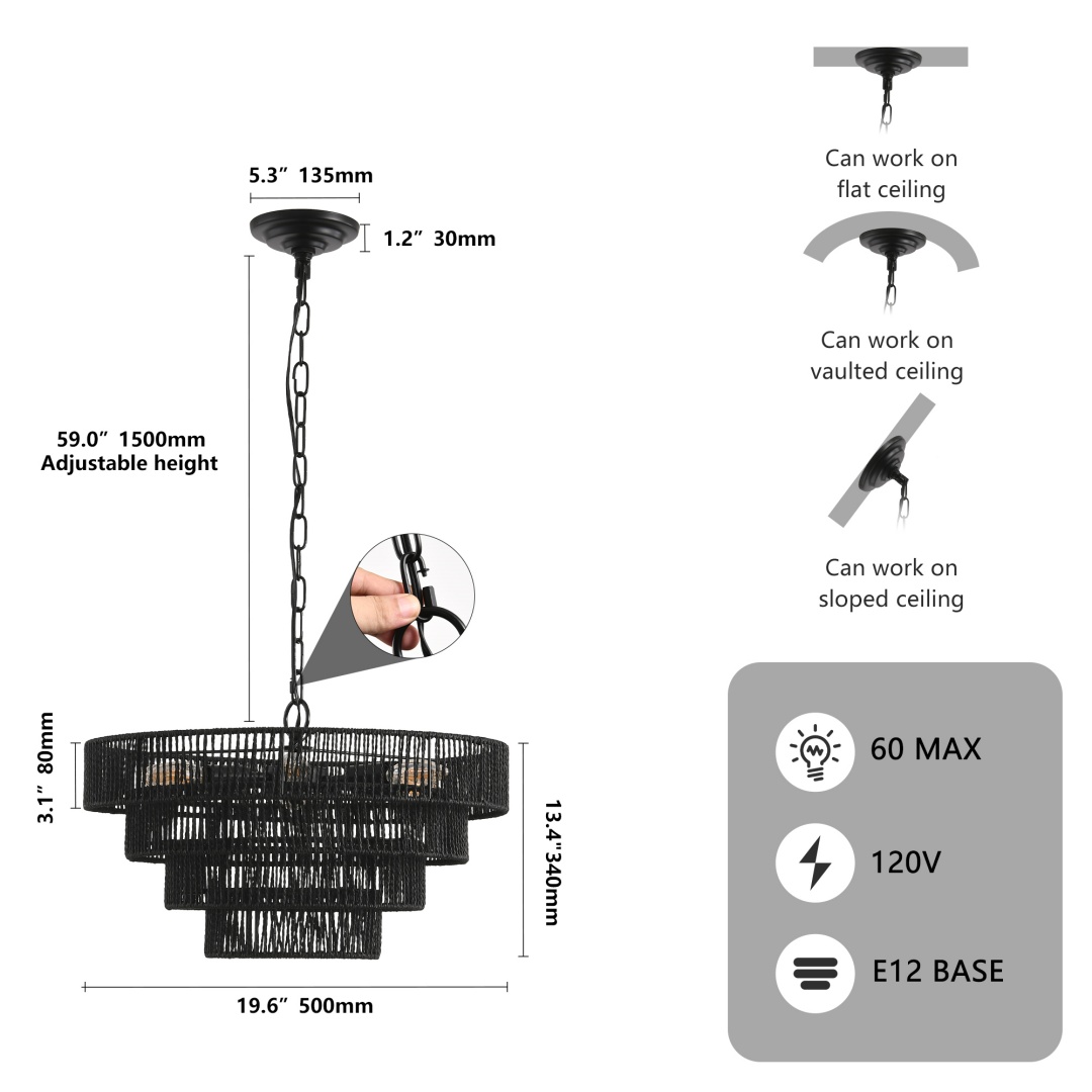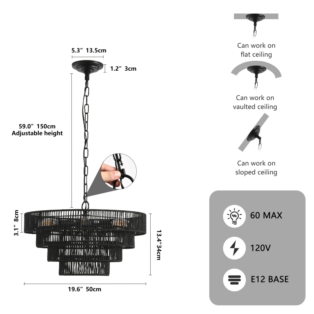 Hand woven hemp rope design: The lampshade is hand woven with natural hemp rope, with a unique texture and a rustic and natural beauty, adding a retro and warm atmosphere to the indoor space.Four layer layered structure: The multi-level lampshade design allows light to be evenly distributed through each layer of hemp rope, creating a soft and unique lighting effect suitable for large areas of space.Equipped with 6 E12 lamp sockets: The lamp is equipped with 6 E12 lamp sockets, providing sufficient light and suitable for use as the main or decorative light in spaces such as dining rooms and living rooms.Industrial retro style: The black frame is paired with hemp rope material, combining industrial and retro design styles, suitable for decorating modern, rural, retro or industrial style indoor spaces, with high decorative value.Easy to install: The accompanying installation accessories and detailed instructions simplify the installation process, making it easy for users to complete the installation.