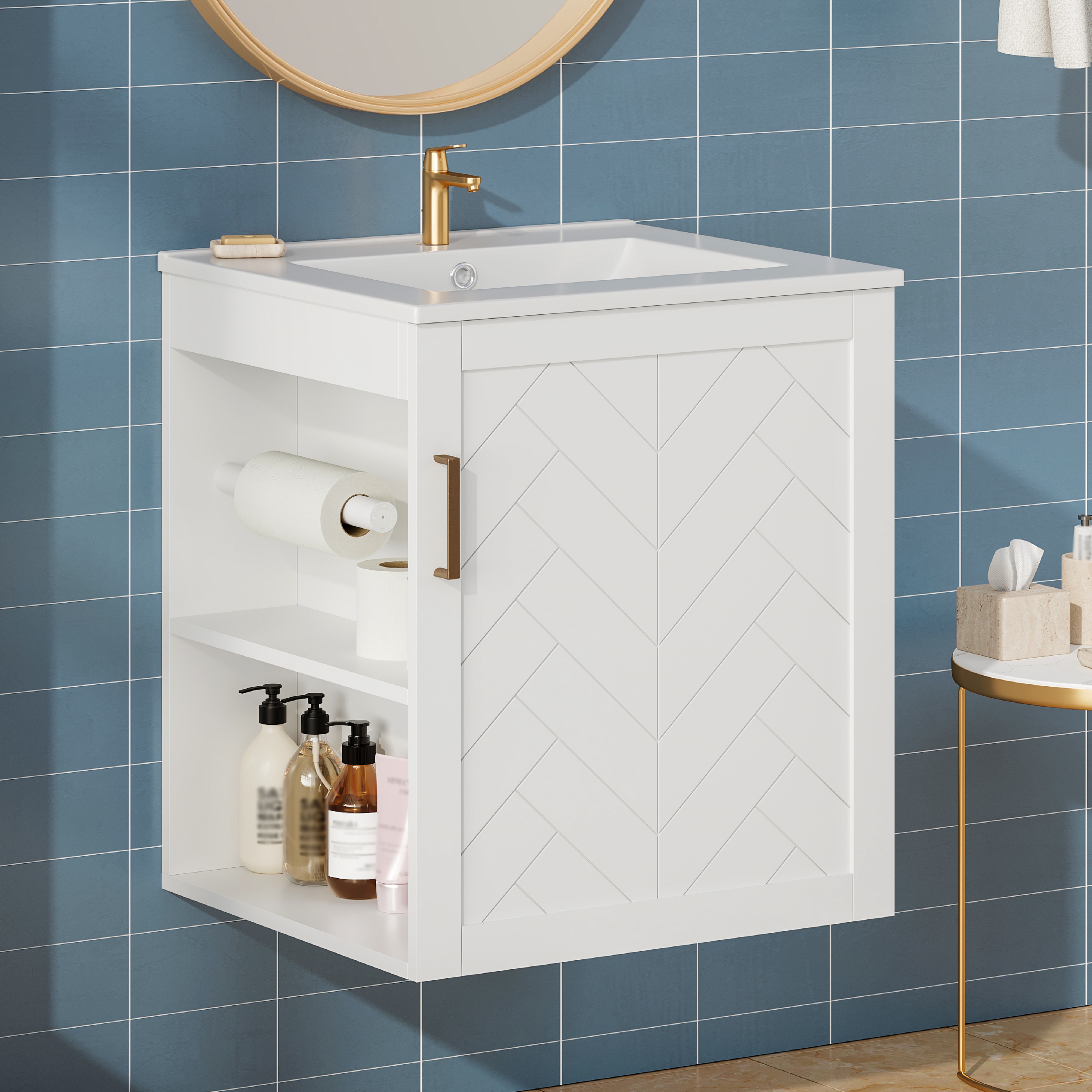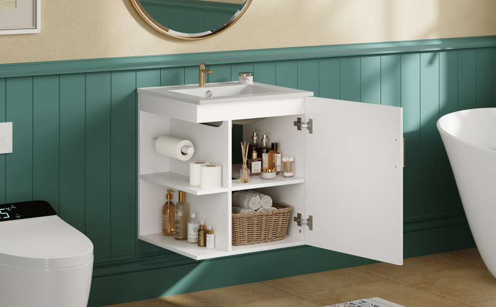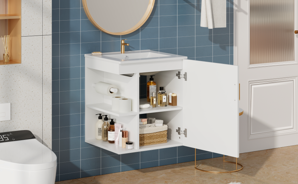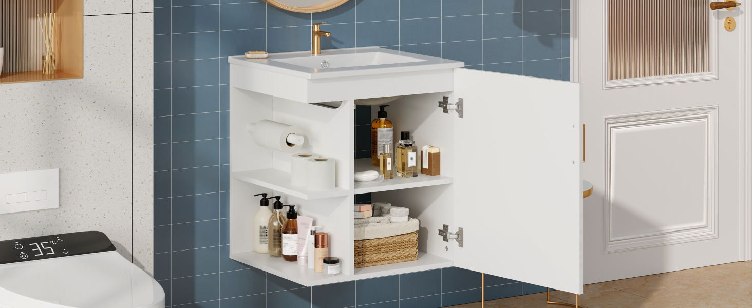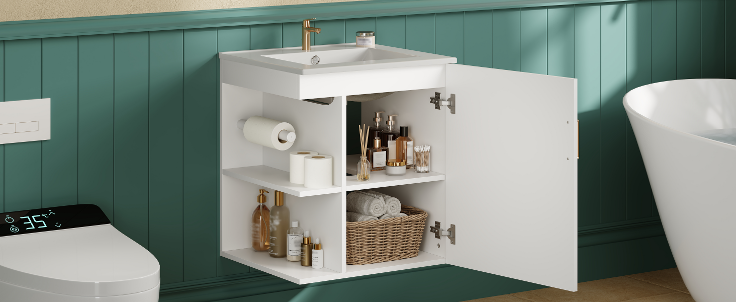 Elevate your bathroom with a wall-mounted cabinet that masterfully combines spacious storage and a space-saving design. It features a closed cabinet for hidden items and open side shelves for daily essentials, helping you declutter your countertop and maintain a clean, organized space. The floating design not only frees up valuable floor area for easier cleaning but also creates an open, airy feel, delivering the perfect blend of practical function and modern style.