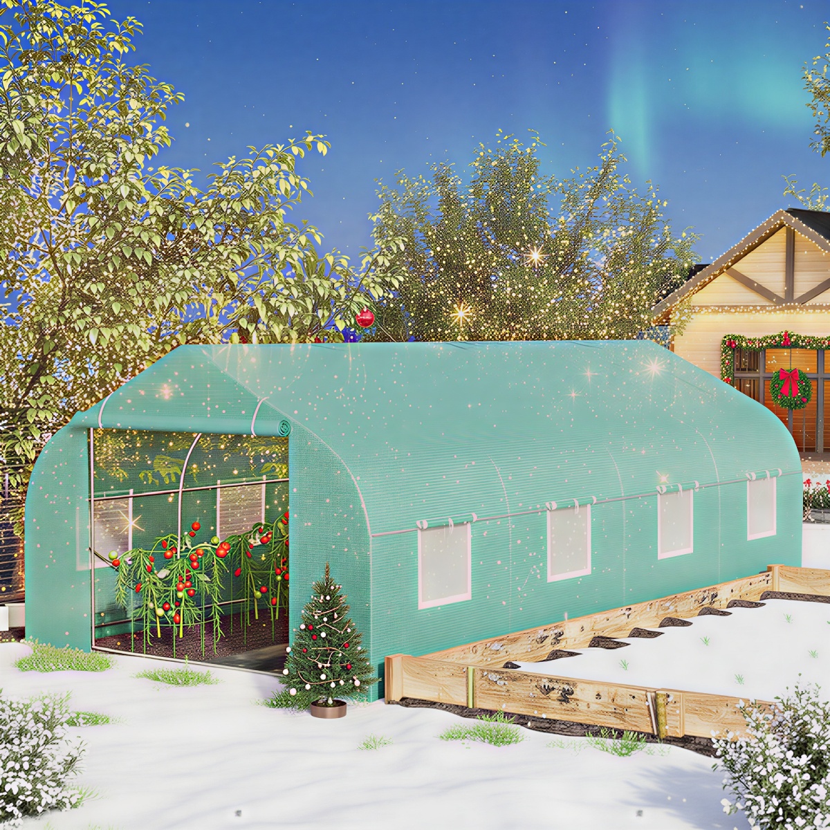 20' X 10' X 7' Outdoor Walk-in Greenhouse, Tunnel Green House With Roll-up Windows, Zippered Door, PE Cover, Heavy Duty Steel Frame, Green