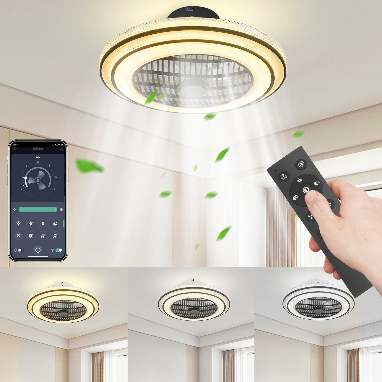 *Dual Control Methods*:You can adjust the light color,brightness,fan speed and timer through the handheld remote control or via the phone APP.