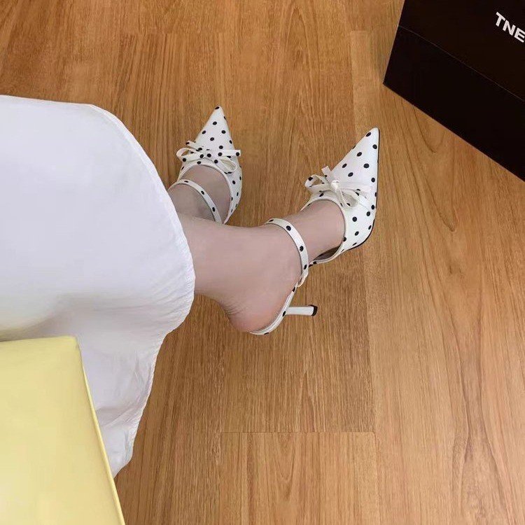 Toe Shape: Pointed toe for a slim, leg-lengthening aesthetic.Closure: Backless slip-on design with a single strap for easy on and off.Decor: Stylish polka dot pattern and bow detail for a playful, feminine look.Color: Black, WhiteHeel Height: Approx. 7-8 cm (elegant and comfortable for all-day wear)Sole: Non-slip rubber sole for stability and durability.