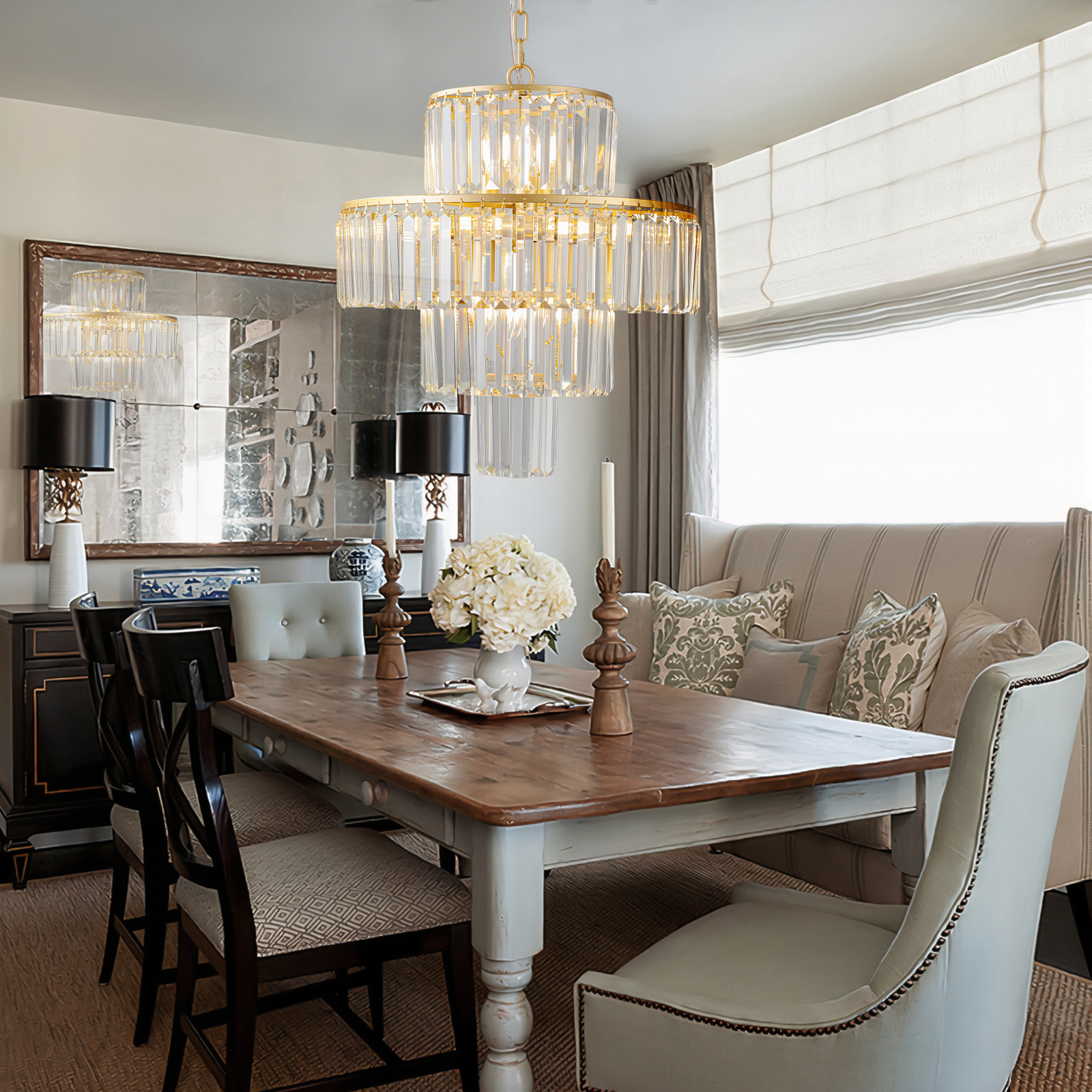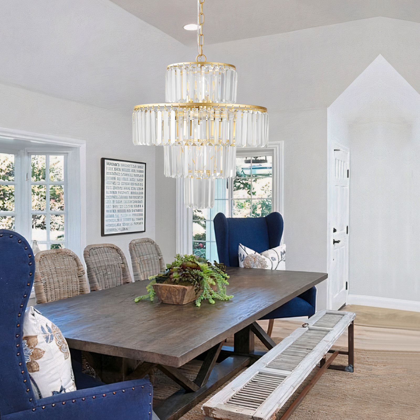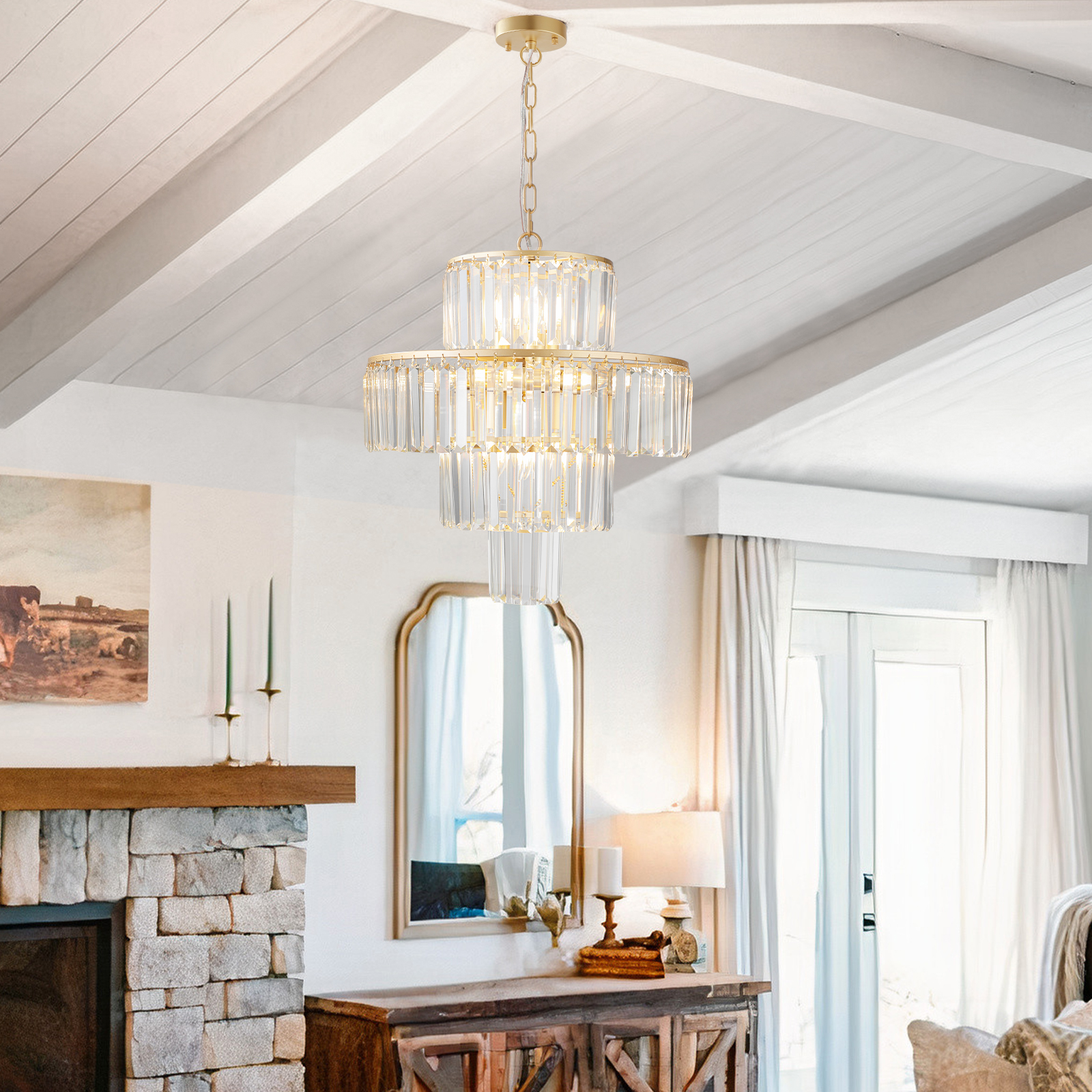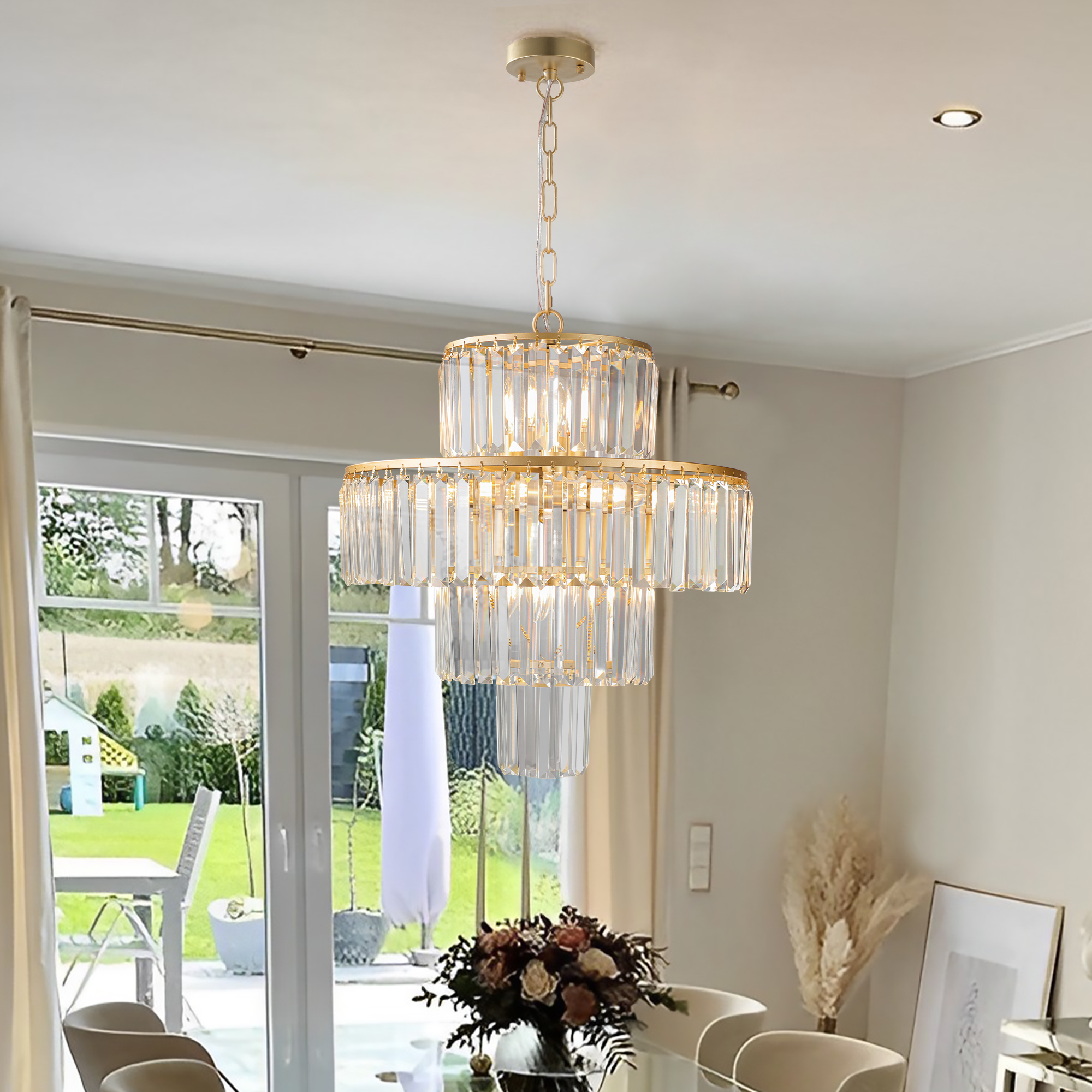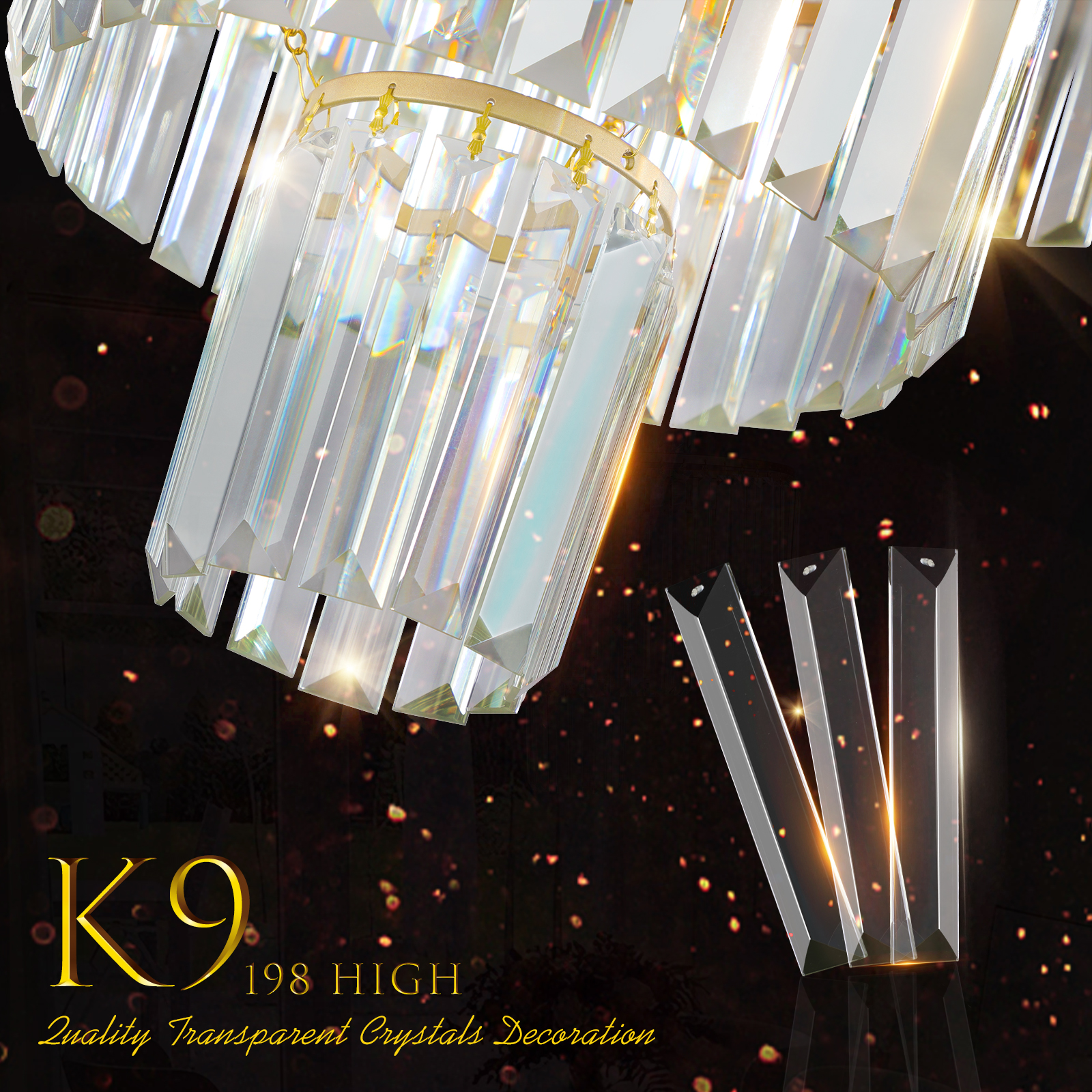 Elegant 4-Tier Design: The chandelier features a sophisticated four-tier arrangement, offering a luxurious and stylish focal point for any space.Premium Crystal Construction: Made with high-quality, clear crystal glass rods, the chandelier adds a touch of glamour and sparkle to your home.Golden Finish: The gold-tone frame adds warmth and refinement, complementing both modern and traditional decor styles.Perfect for Large Spaces: Ideal for dining rooms, living rooms, foyers, or entryways, this chandelier brings bright, ambient light to larger areas.Easy to Install: Designed for simple installation with all necessary mounting hardware included, making it hassle-free for homeowners.
