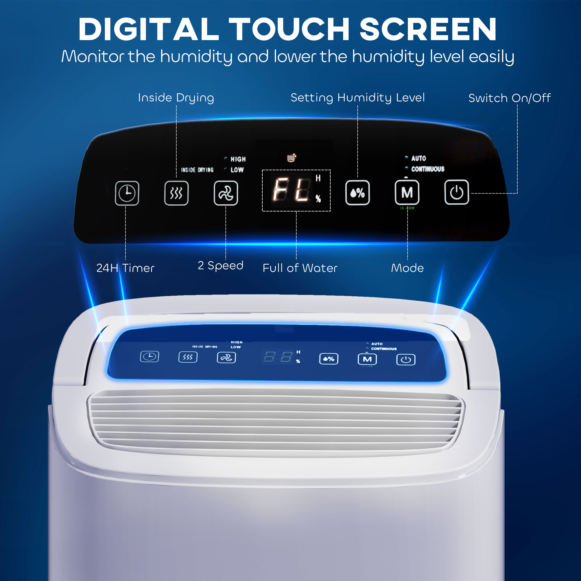 Wave goodbye to dampness with this air dehumidifier for home. It removes up to 20L of moisture, for areas between 20-50m² - keeping your space comfortable and dry. It's great as a dehumidifier for damp areas in the home. You can either rely on the 5L water tank or drainage hose for continuous operation. All managed with the easy touch control and LED screen.