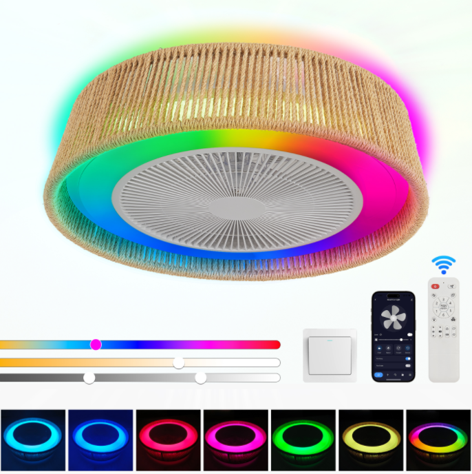 Unique hemp rope weaving design:Using environmentally friendly hemp rope hand woven lampshades, combined with modern and pastoral styles, adding a warm and natural home atmosphere, it is very suitable for users who like personalized decoration.LED RGB Colorful Lighting:Equipped with adjustable RGB lighting function, providing multiple color options to meet different scene needs, such as family gatherings, leisure time, or romantic dinners.Silent ceiling fan:Built in high-efficiency silent fan, providing strong and quiet air circulation function, keeping indoor air fresh while avoiding the noise interference of traditional fans.Multi functional integrated design:The perfect integration of lighting and fans saves space and enhances user convenience, making it ideal for small apartments or users who require multifunctional lighting solutions.Simple installation:Provide detailed installation instructions, the ceiling design is easy to install, saving time and effort, and can be easily completed without the need for professional technicians.
