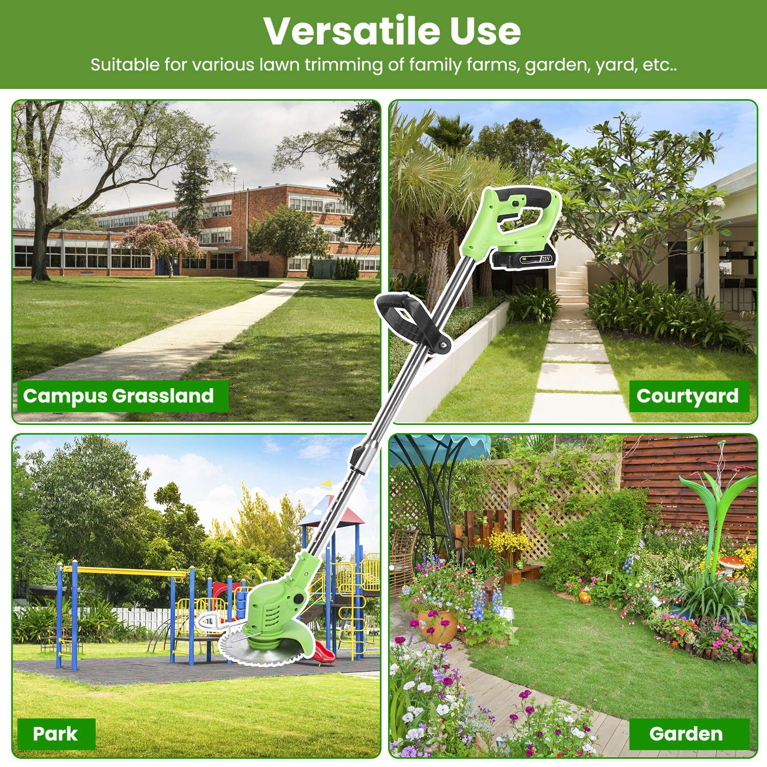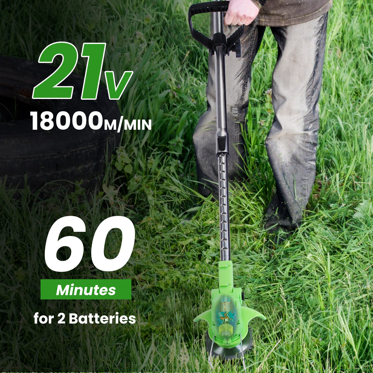 *Lightweight & Powerful*:Lightweight and compact,easy to carry. With 2Pcs 1500mAh rechargeable batteries and built in 300W powerful motor,our cordless grass trimmer runs 60 minutes for continuous use and offers 18000m/min no-load speed,definitely making your yard look neat and tidy!