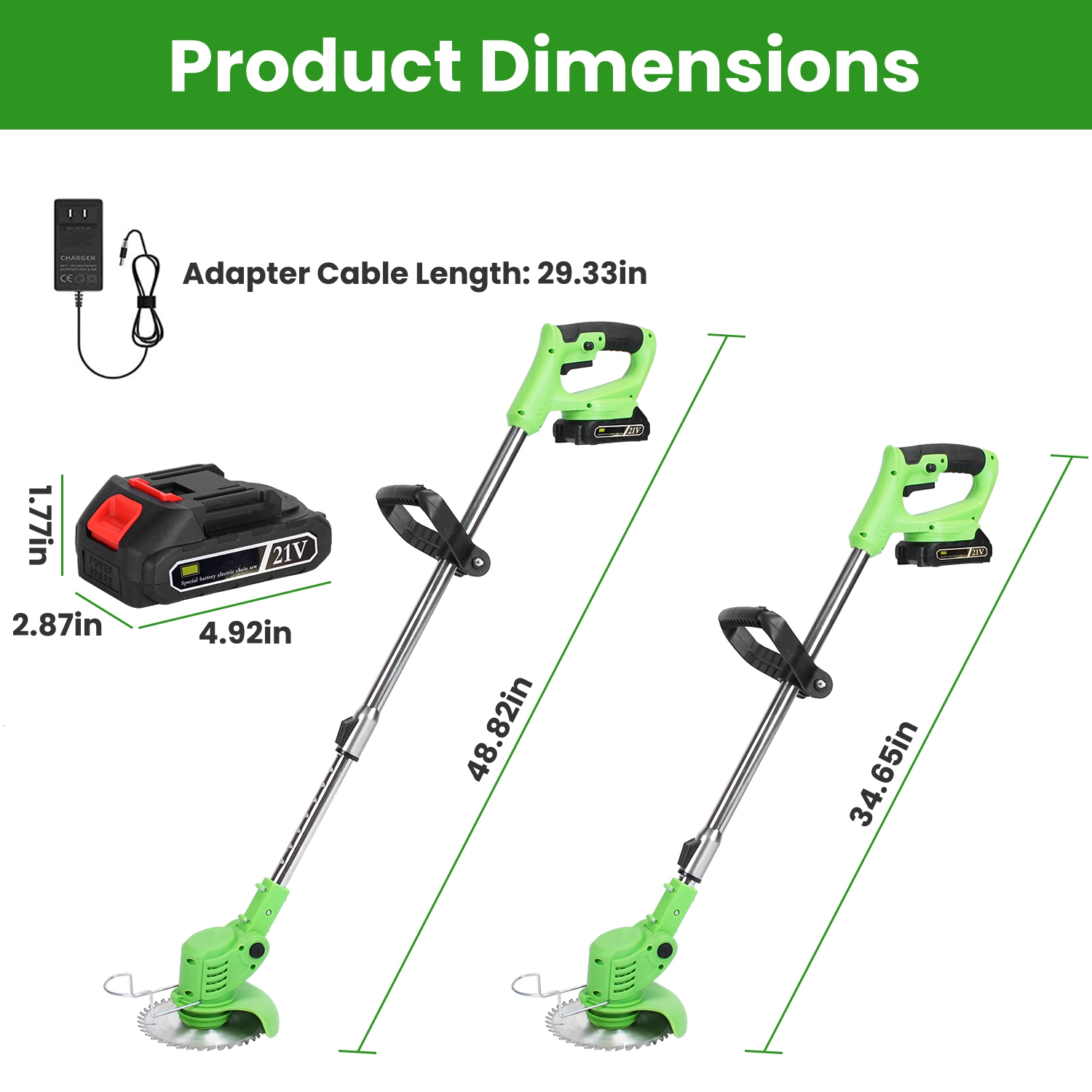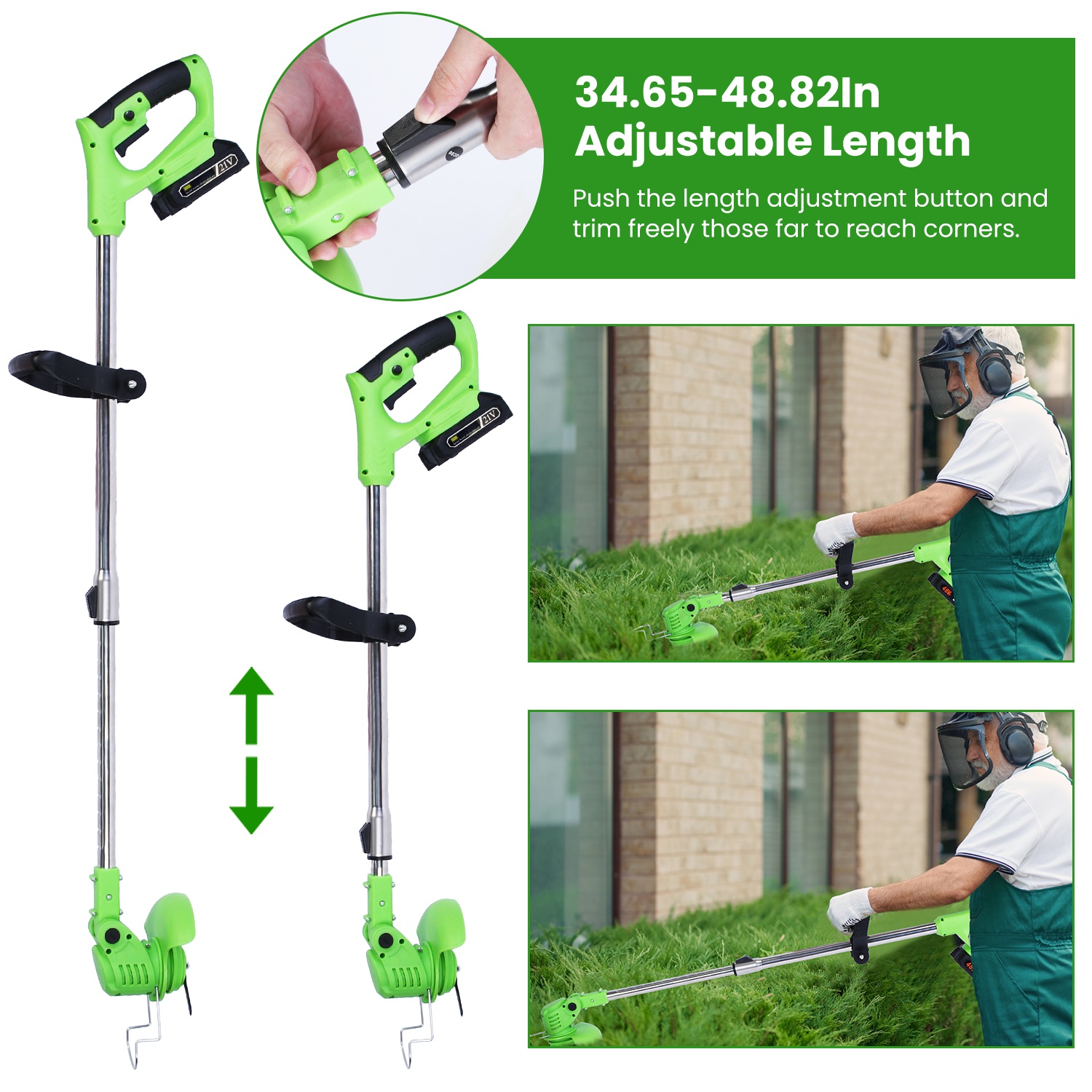 *Adjustable Length & Angle*:Once pushing the Length Adjustment Button,our weed cutter can be adjusted from 34.65 to 48.82in freely to trim those far to reach corners. If you press the Head Adjustment Button,you can adjust trimming angle and trim the grass easily for those hard to reach corners.