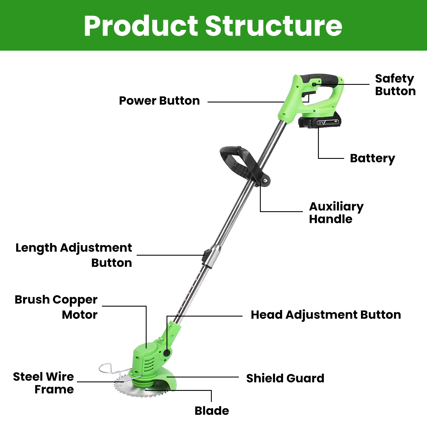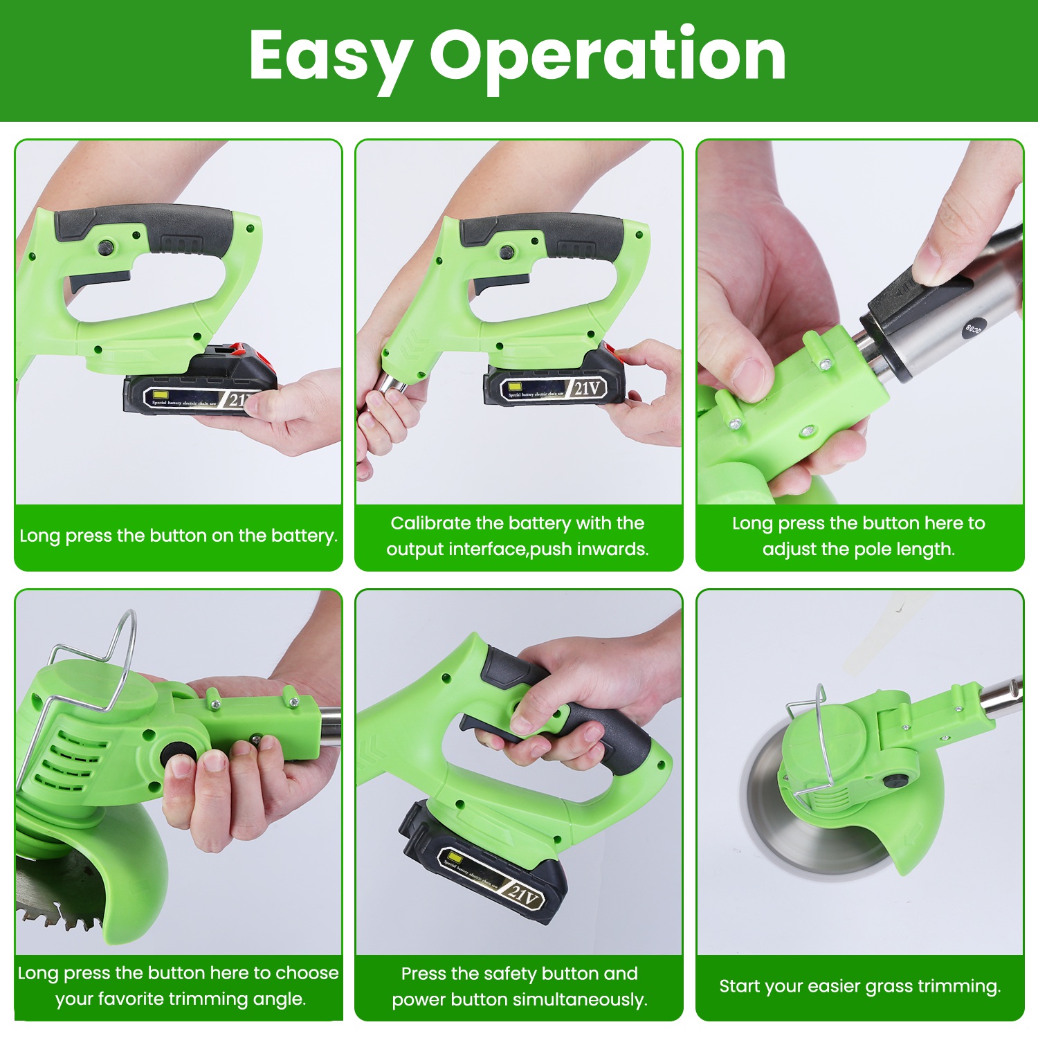 *Easy To Operate*:Adjust the pole length and trimming angle,then simultaneously press safety button and power button to start your weed mowing. The safety lock design makes you more reassured. The adjustable auxiliary handle can be installed on the pole,which makes mowing less laborious. The shield guard help prevent grass clipping. The metal wire frame reduces blade damage.