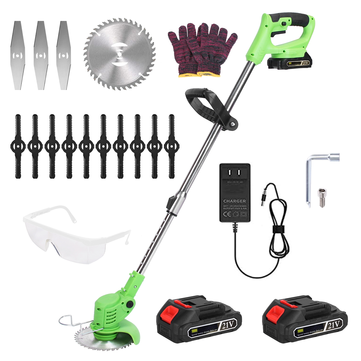 *3 Types Of Blades*:Our lawn mower provides 1pc saw blade for crop and bush cutting,3pcs stainless steel blades for bush and thick grass pruning,and 10pcs plastic blades for lawn mowing. Suitable for various lawn trimming of family farms,garden,yard,etc..