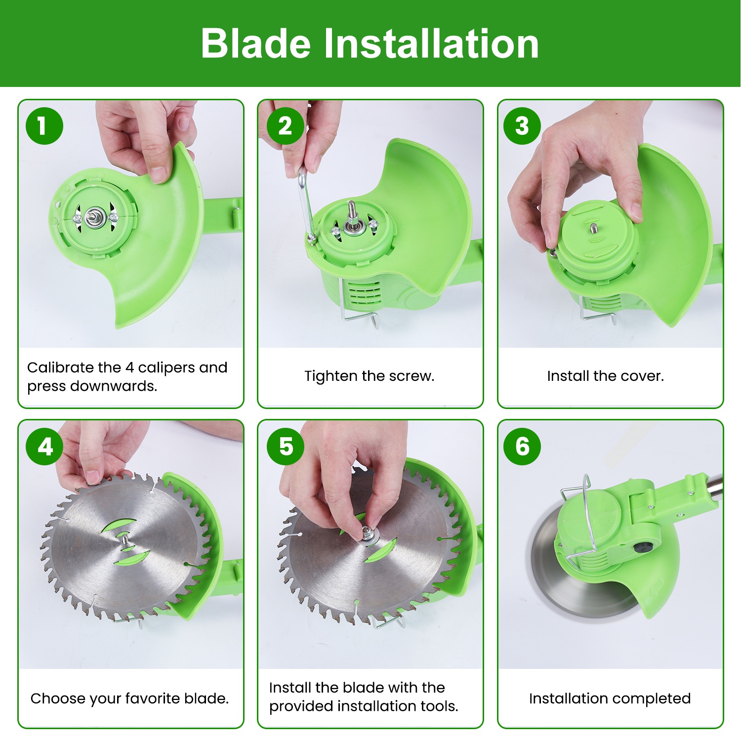 *Easy Installation*:The cordless string trimmer is easy to install. First,install the steel wire frame and auxiliary handle. Second,install the shield guard and blade with the wrench. Third,fix the shield guard and blade.