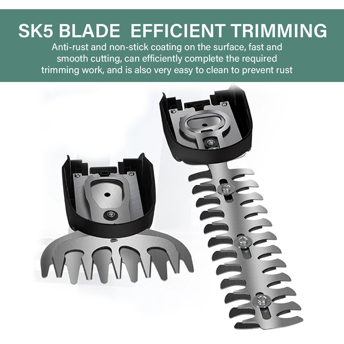 Dual-actional Blades: cordless hedge trimmer blade is made of stainless steel, an extremely sharp and stable structure. 9 inches hedge trimmer blade and 5 inches grass shears blade. (5/16ââ max shrubbery cut diameter) The electric hedge trimmer featured dual blades design, blade cuts once, then again on the backside, efficiently, quickly, and smoothly