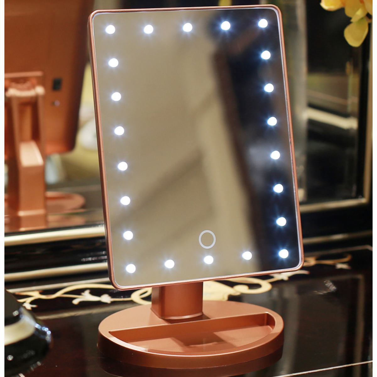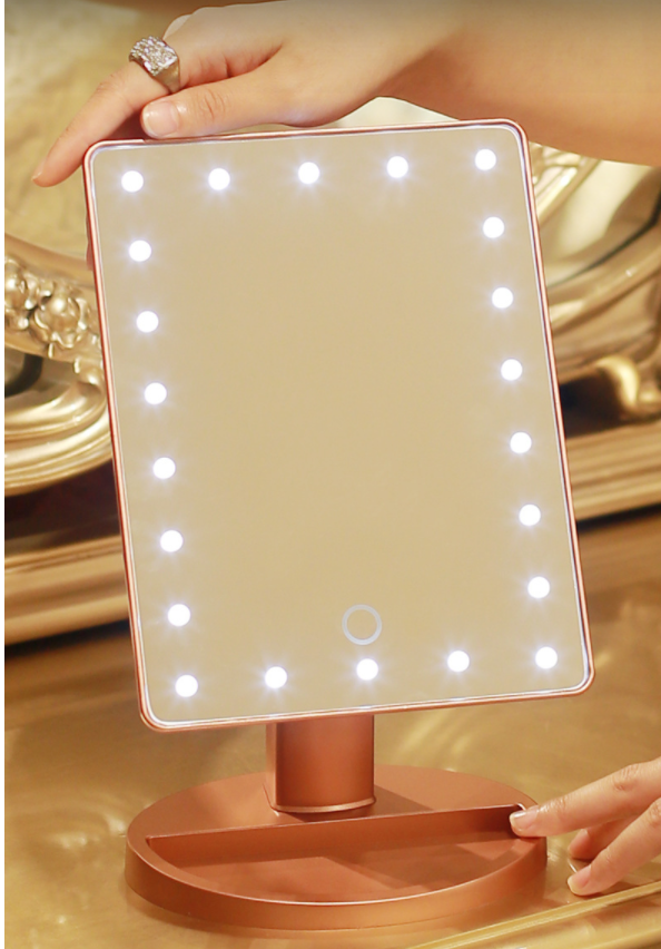 Firmly press the circle on the front of the mirror, the lights will be illuminated
