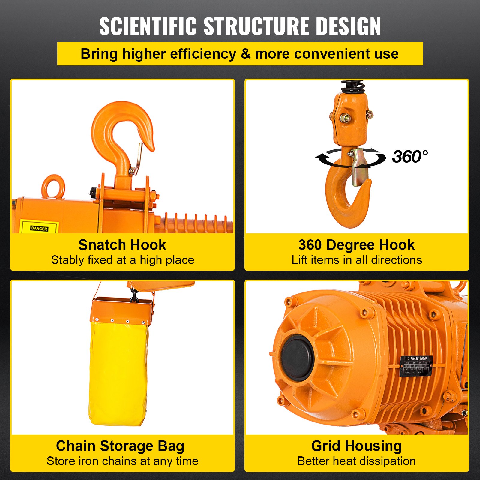 G80 Chains & Forged Steel Hook: Lifting Speed: 13'/min. Lifting Height: 10'. Adopted G80 Mn-steel chains with welding joints and Mn-steel hot forging steel with security latch. Also, the lower hook can rotate 360 degree.