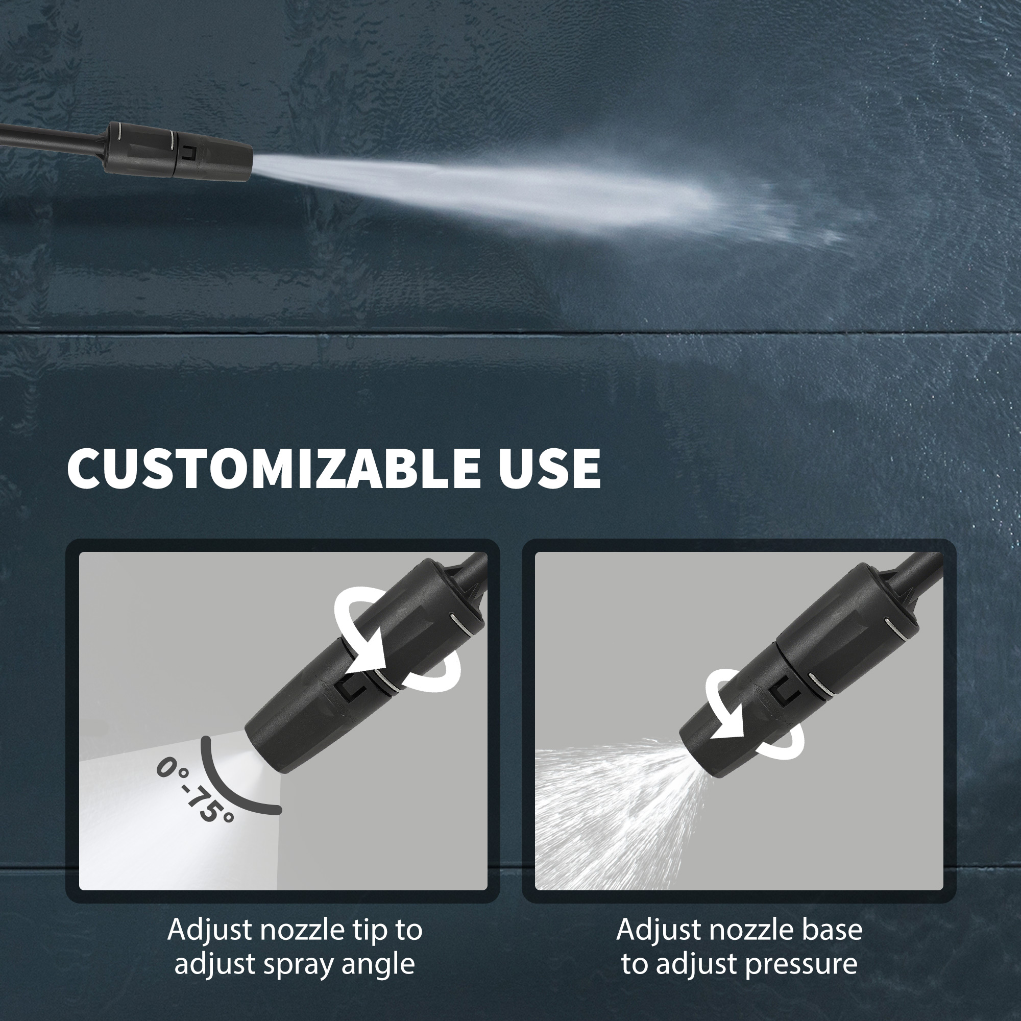 Easy home cleaning of stubborn tasks - this portable pressure washer. 2200 W motor, with a 170 bar pressure is powerful - provides 420 litres of water per hour. Deal with a variety of dirt and stains. You can adjust the nozzle angle between 0° and 75°, making it easy to direct the pressured water to a position you require. With the six-metre long hose, five-metre long power cord and wheels, you can move it around and reach long distances easily.